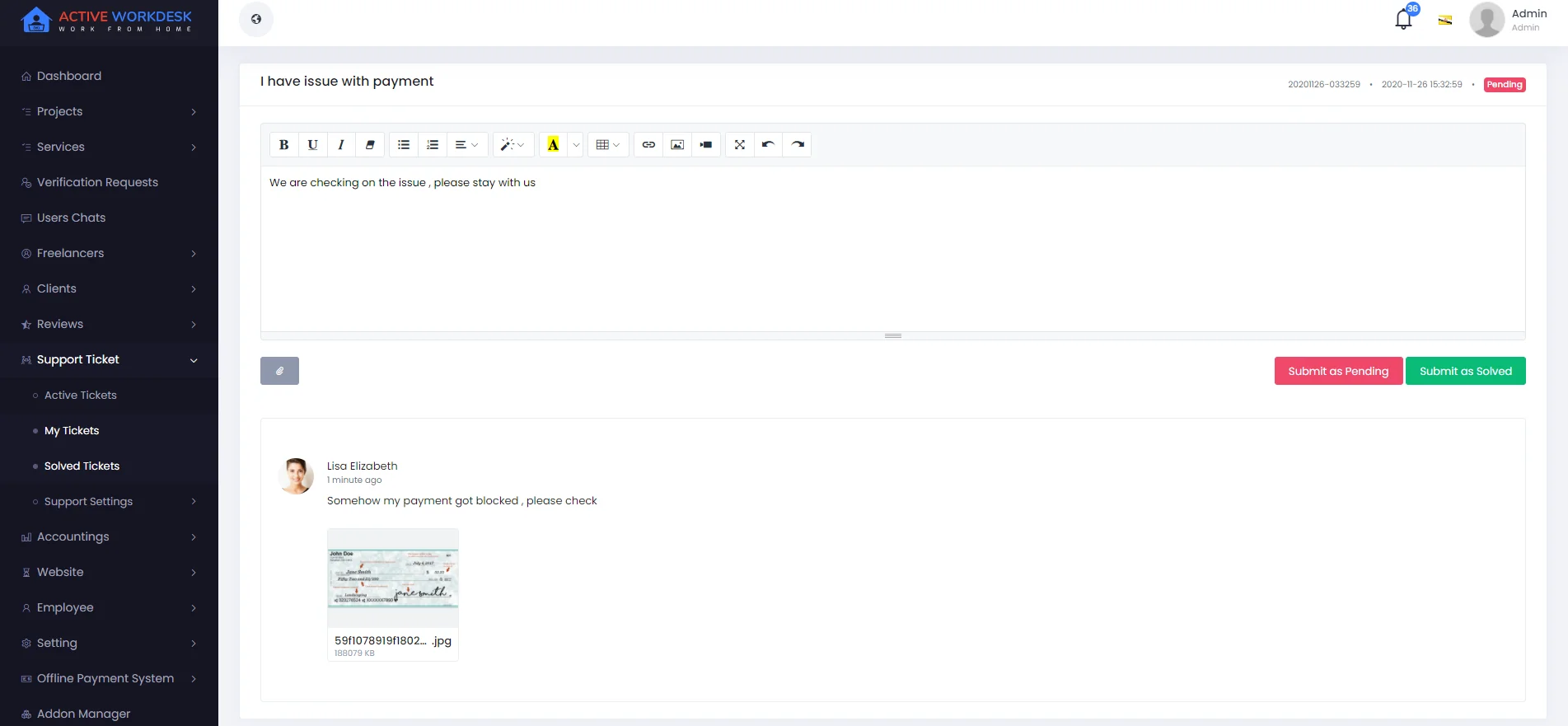 Purchase today! & use Support Ticket System for your freelancing business which is only developed with the most efficient freelancing marketplace cms named Active Workdesk cms. By this Support Ticket Addon enables the features for clients and freelancers to communicate with the admin. Admin can assign satffs to ticket the support messages and reply to them. Also tickets can be organized according to category and status.