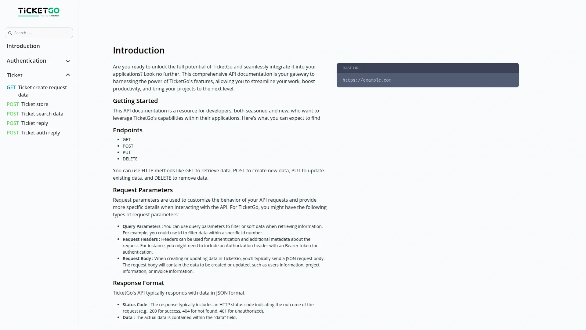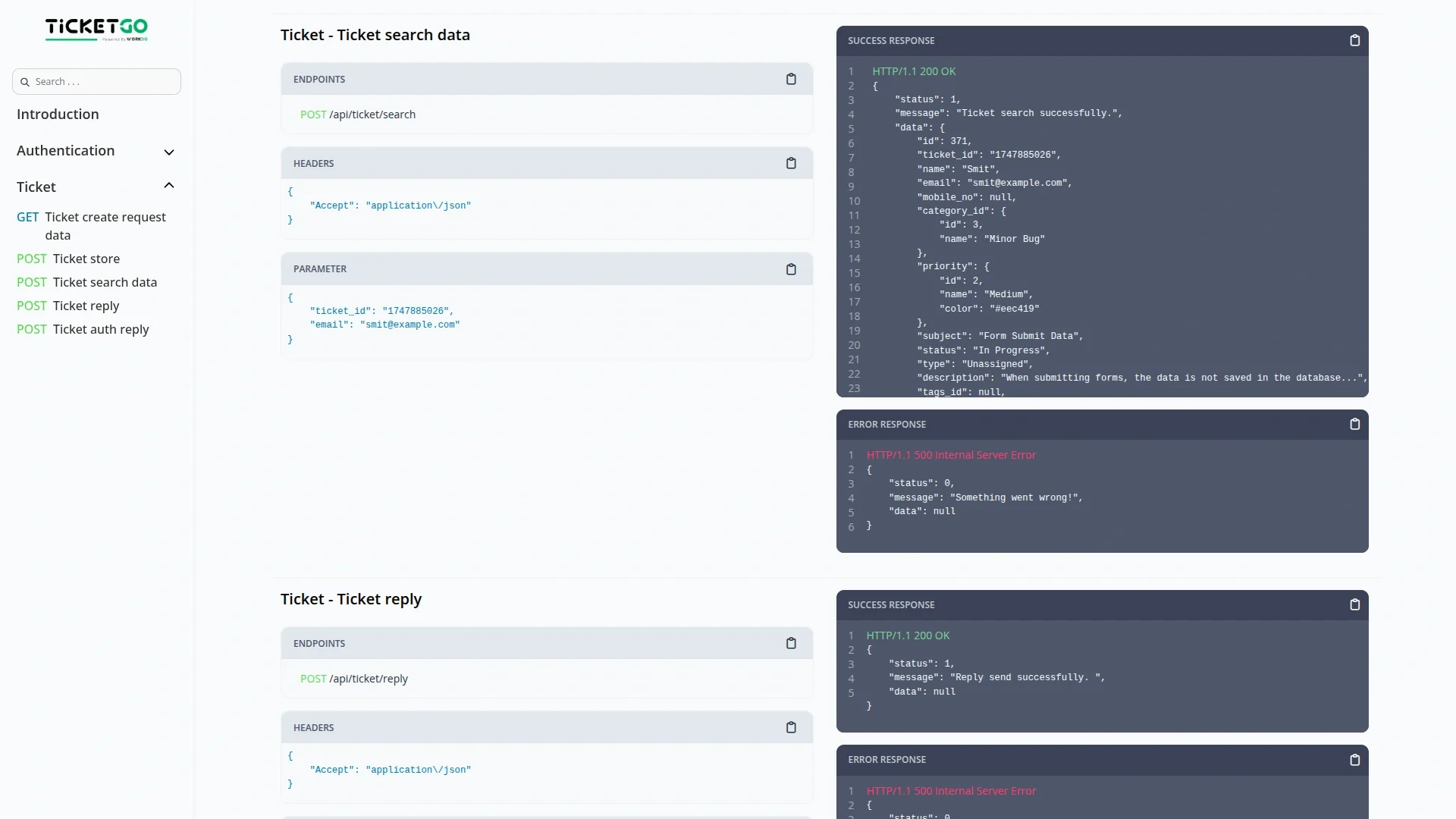 The API Add-On of TicketGo allows system-to-system communication through a defined set of API endpoints. With this Add-On, you can perform login and logout actions, fetch the required fields for creating a ticket, store ticket data, search for existing tickets using specific values, and reply to tickets in real time.