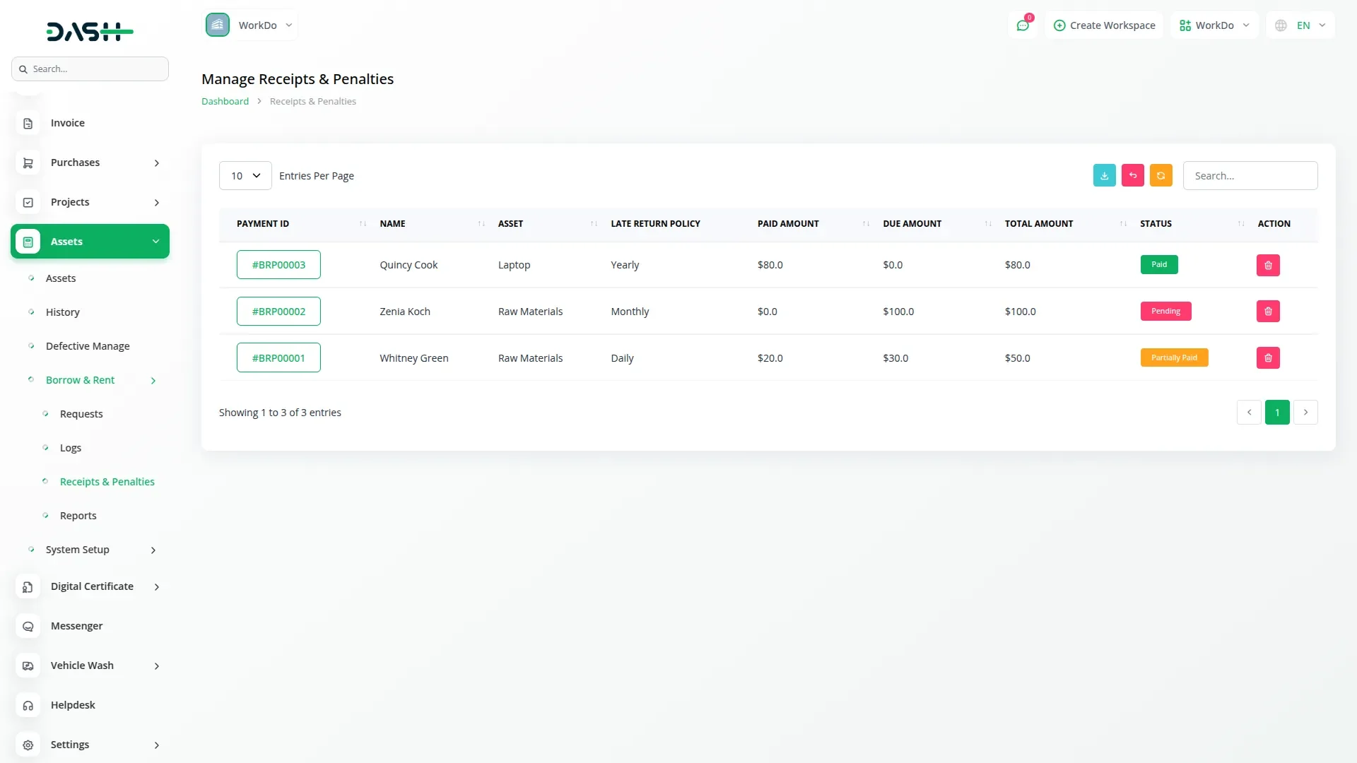 Integrated payment processing handles all financial aspects of asset borrowing and rental operations. The system automatically calculates penalties based on configurable rules, including daily, monthly, or yearly rates. Late fee computation considers return dates and applies appropriate charges according to policies. Comprehensive receipt management provides transparent financial tracking for all transactions with detailed payment records and allows receipts to be downloaded in PDF format.