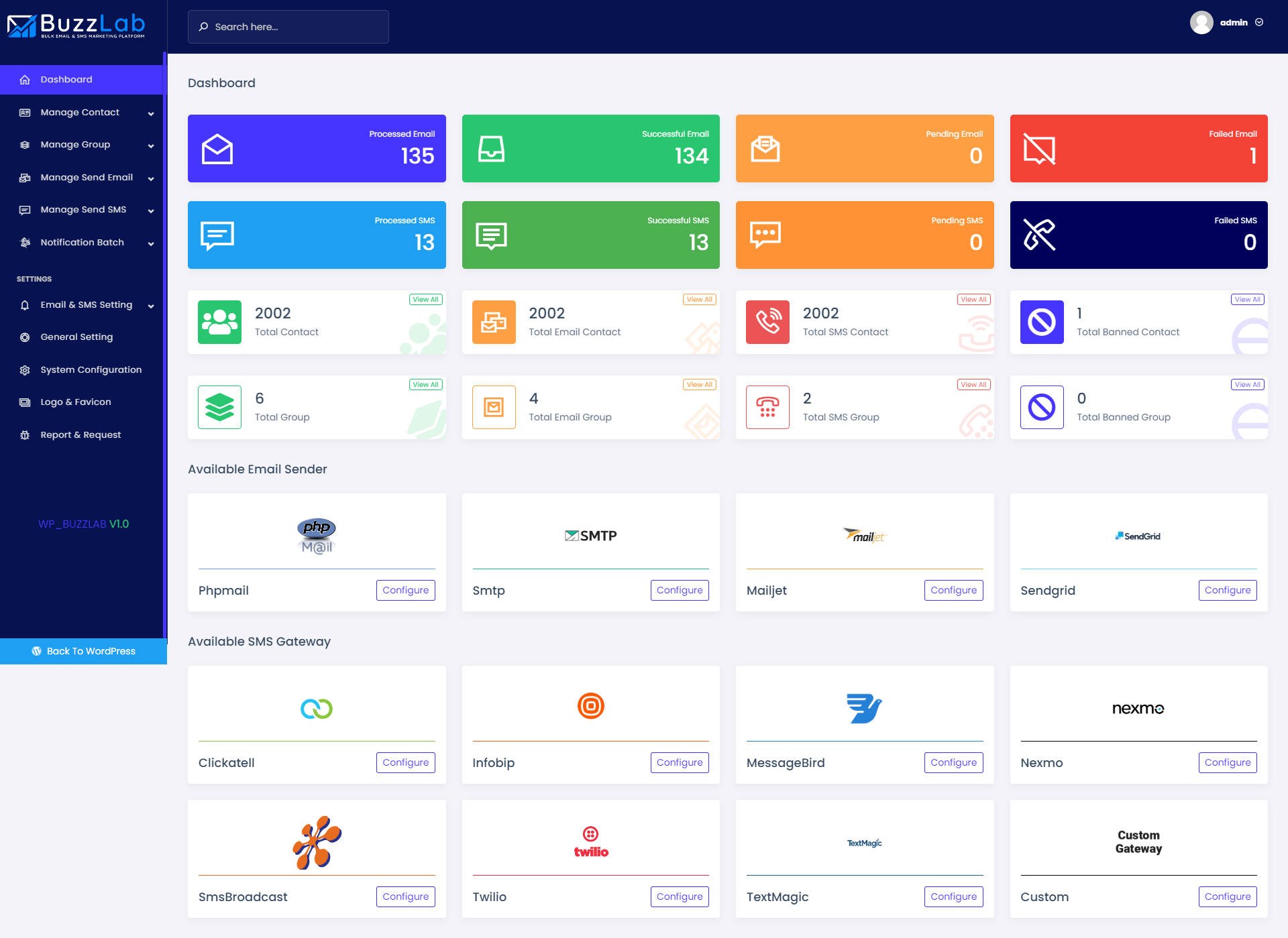 BuzzLab is a professional and easy-to-use marketing plugin for WordPress that enables you to run both email and SMS marketing campaigns directly from your WordPress dashboard. Built by ViserLab, it's intended for marketers, business owners, lead generators, newsletter senders, and digital marketers who want a unified marketing solution without relying entirely on external SaaS tools.