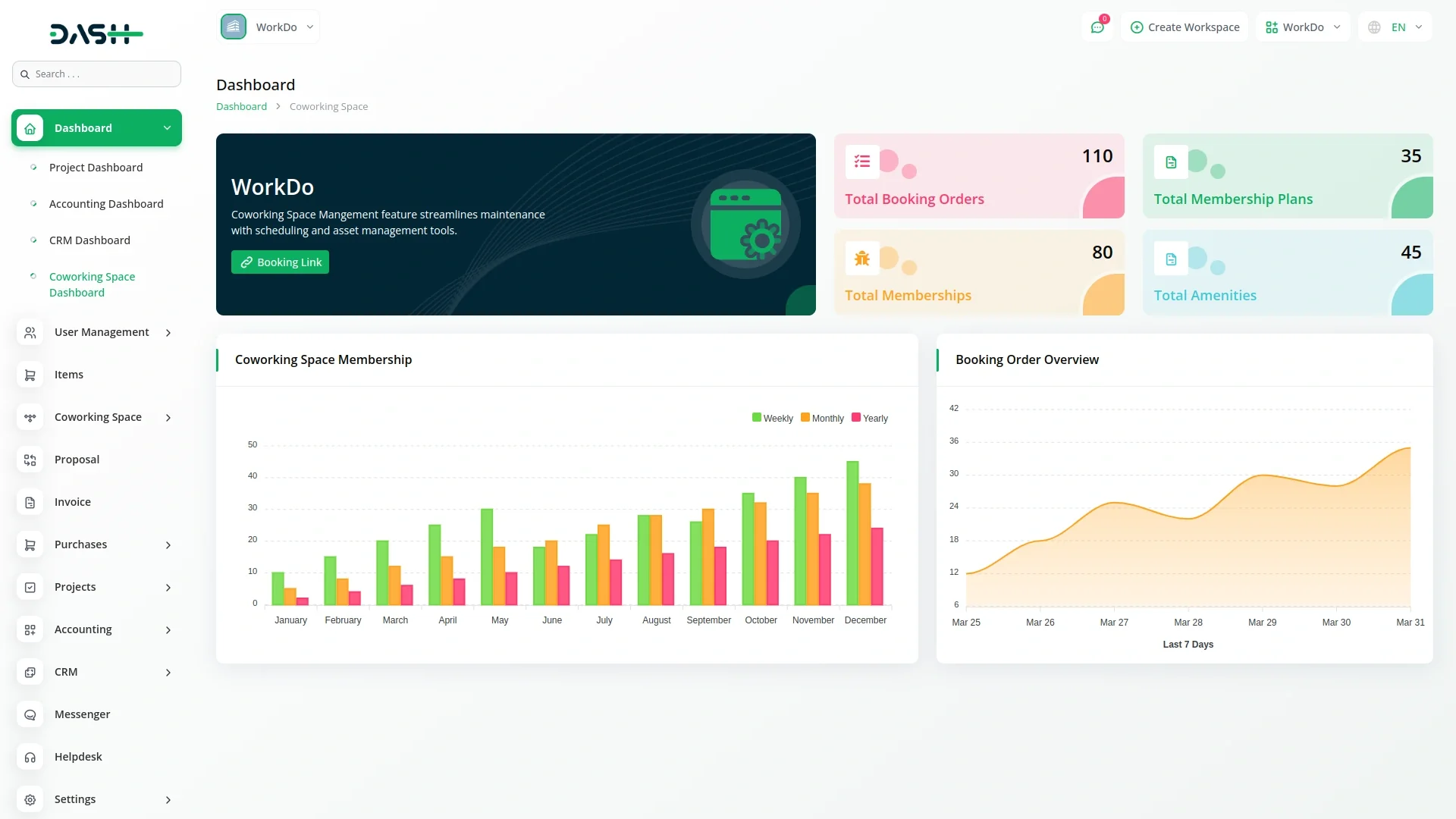 Coworking Space Management – Dash SaaS Add-On is a smart solution designed to manage coworking spaces, shared offices, and flexible work environments. It includes features like desk and room booking, member registration, billing and invoicing, access control, and scheduling. Integrated seamlessly with Dash SaaS, this add-on streamlines operations, improves space utilization, and enhances the overall member experience for coworking space operators.