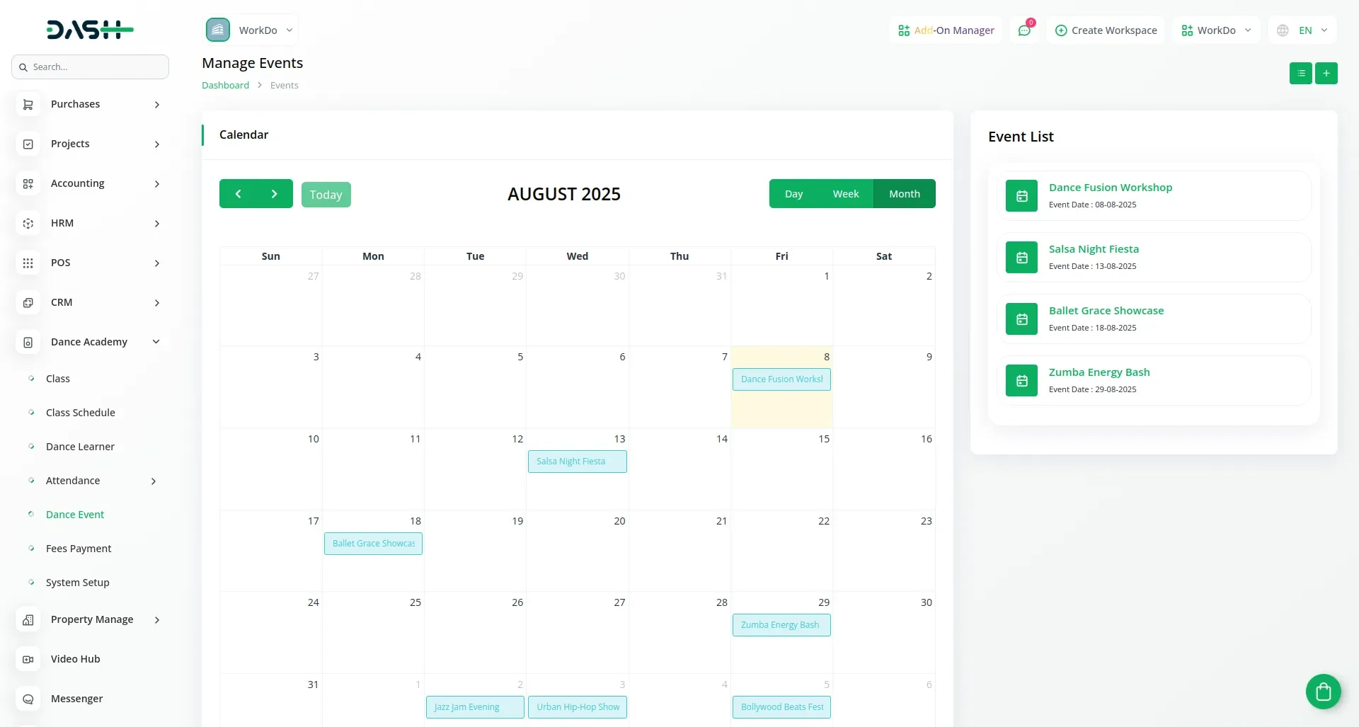 The Dance Academy add-on for Dash SaaS delivers a complete management solution for dance schools, studios, and training centers. It allows administrators and instructors to organize classes, manage batches, track student progress, and run studio operations from one centralized interface. With tools for scheduling, enrollment, instructor assignments, and attendance monitoring, this add-on streamlines workflows and enhances both teaching and learning experiences.