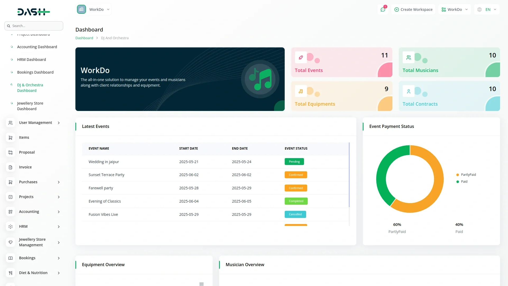 The DJ and Orchestra Management – Dash SaaS Add-On is a powerful tool designed for music event coordinators, entertainment agencies, and individual performers to seamlessly manage DJ schedules, orchestra bookings, client requests, event timelines, and payments. From managing artist profiles, gig history, and contract generation to assigning orchestras to venues or clients, this module streamlines the entire workflow of musical performances. Enable real-time booking, event notifications, invoicing, and calendar synchronization for DJs, musicians, and clients. Perfect for wedding planners, event organizers, and music agencies looking to automate and scale their operations.