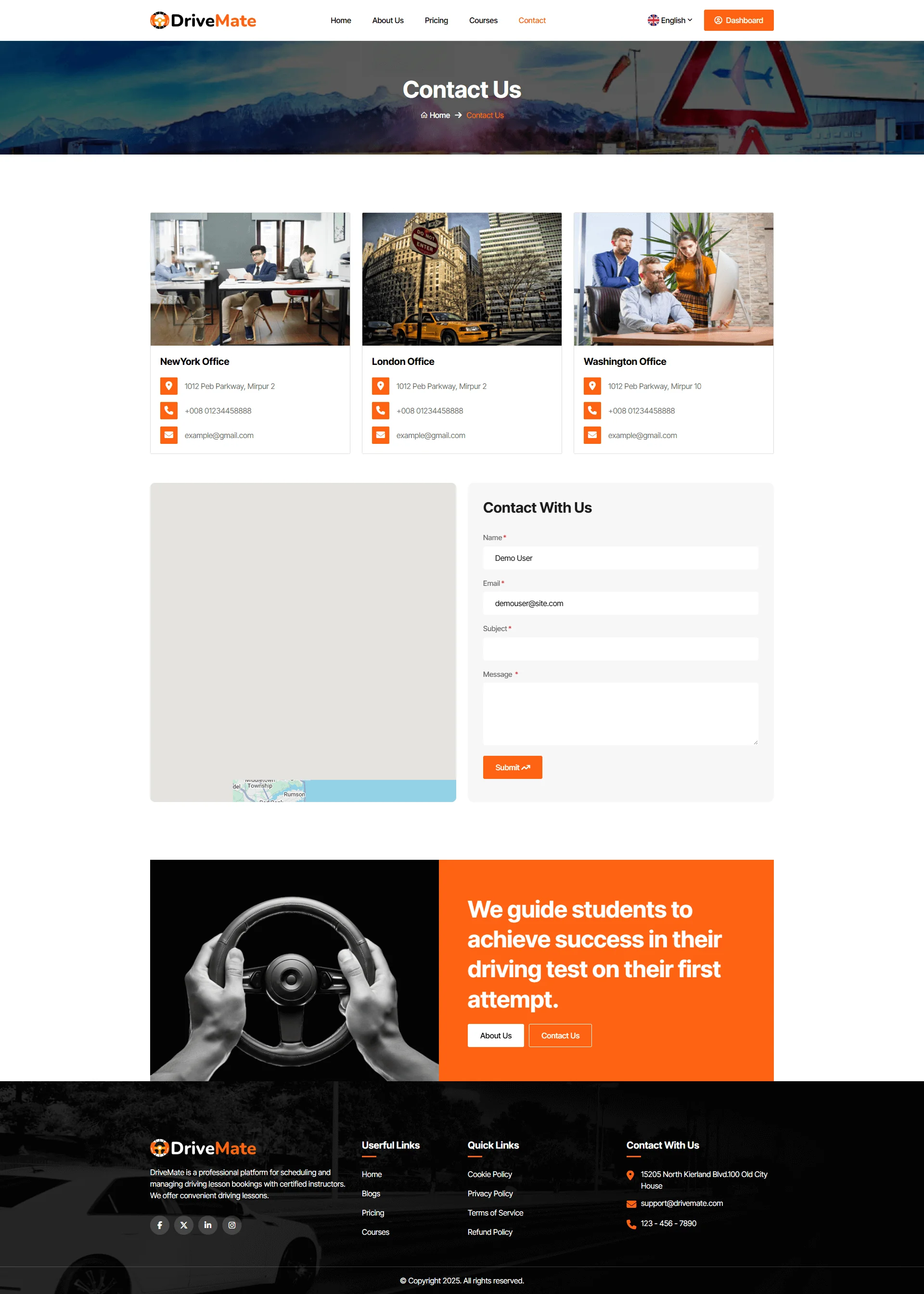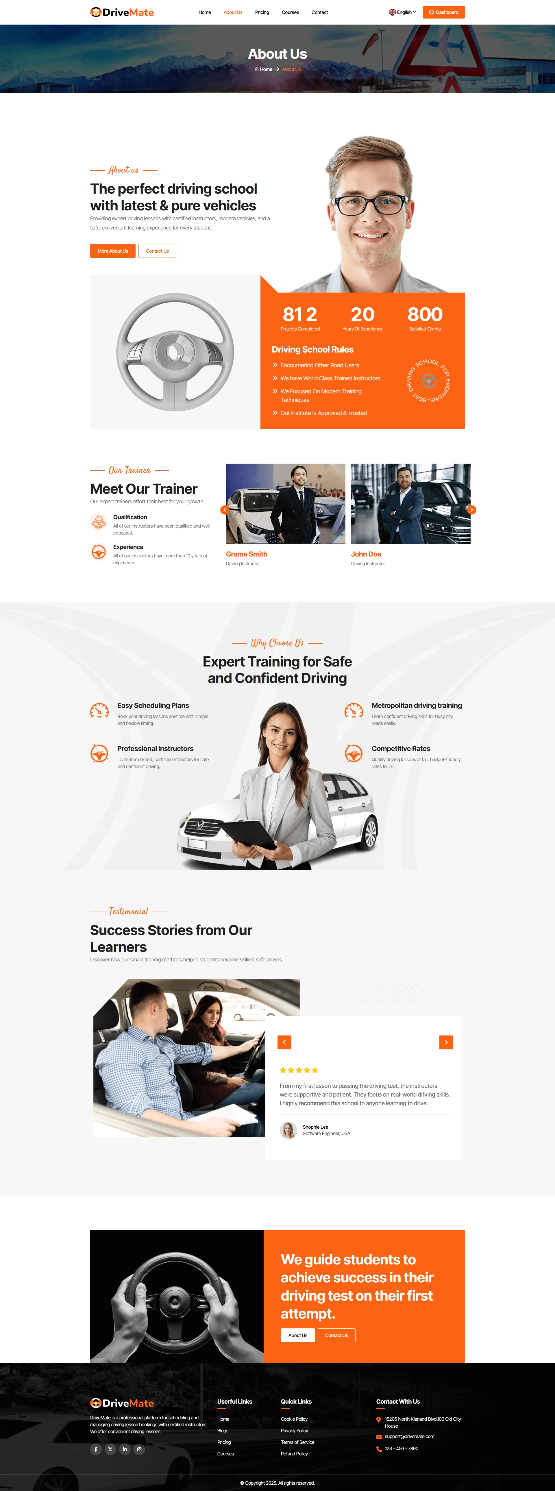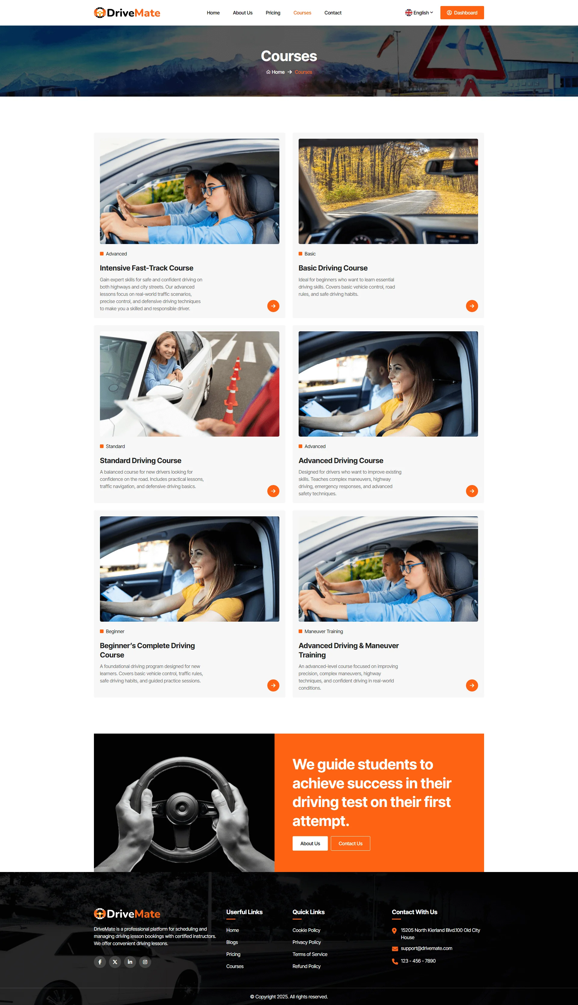 DriveMate is a modern and intuitive online Driving School and driving training center platform. A driving school is an educational service that trains people to operate a vehicle safely and responsibly. It typically provides both theoretical training and practical training. There are millions of driving schools around the world, and our goal is to bring them online through our Driving School automation platform, DriveMate. Our platform includes everything you need to manage your driving school business. It comes with a complete course catalog, subscription and pricing plans, add-on services, online payment integration, automated invoicing, and a user dashboard. All tools are built in, so you can manage students, payments, and services in one place.