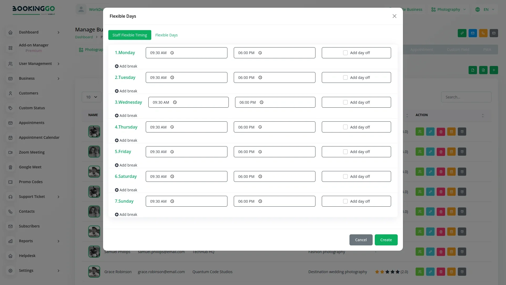 With the Flexible Days Module, appointment management becomes streamlined and efficient. Staff members can easily update their availability within the BookingGo SaaS platform, and these changes are instantly reflected across all aspects of the system. This integration ensures that appointments are always accurate and up-to-date, reducing the risk of double bookings or scheduling conflicts.