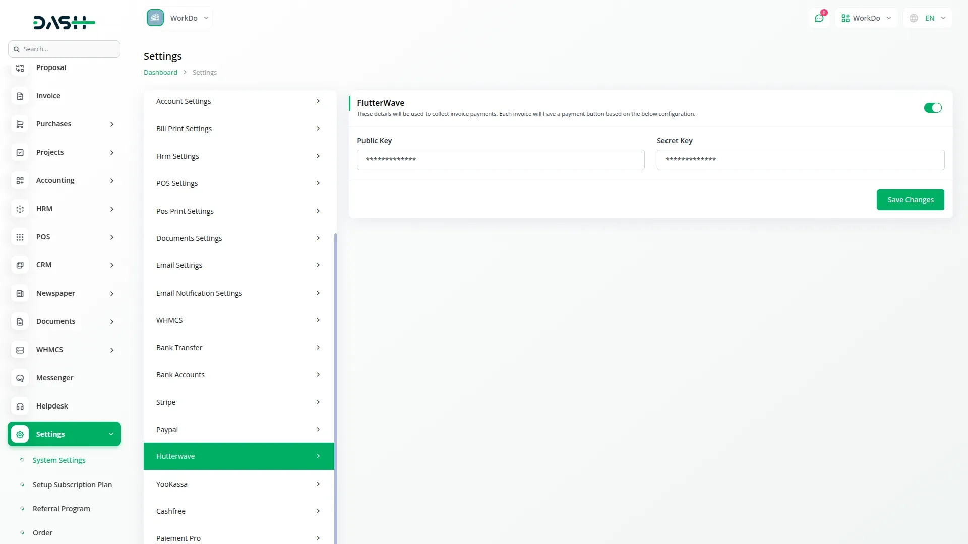 The API Key Settings Page for Flutterwave Integration allows you to securely connect your application or website with the Flutterwave payment gateway. By configuring your API keys on this page, you enable your platform to interact with Flutterwave services, providing seamless payment processing and transaction management. Both Superadmin and Company accounts can utilize this integration, though each has a specific focus. The Superadmin integration is primarily for handling subscription-based payments, while the Company integration handles payments related to invoices and other one-time transactions. Both roles share the same integration setup, ensuring ease of use and consistency across the platform.
