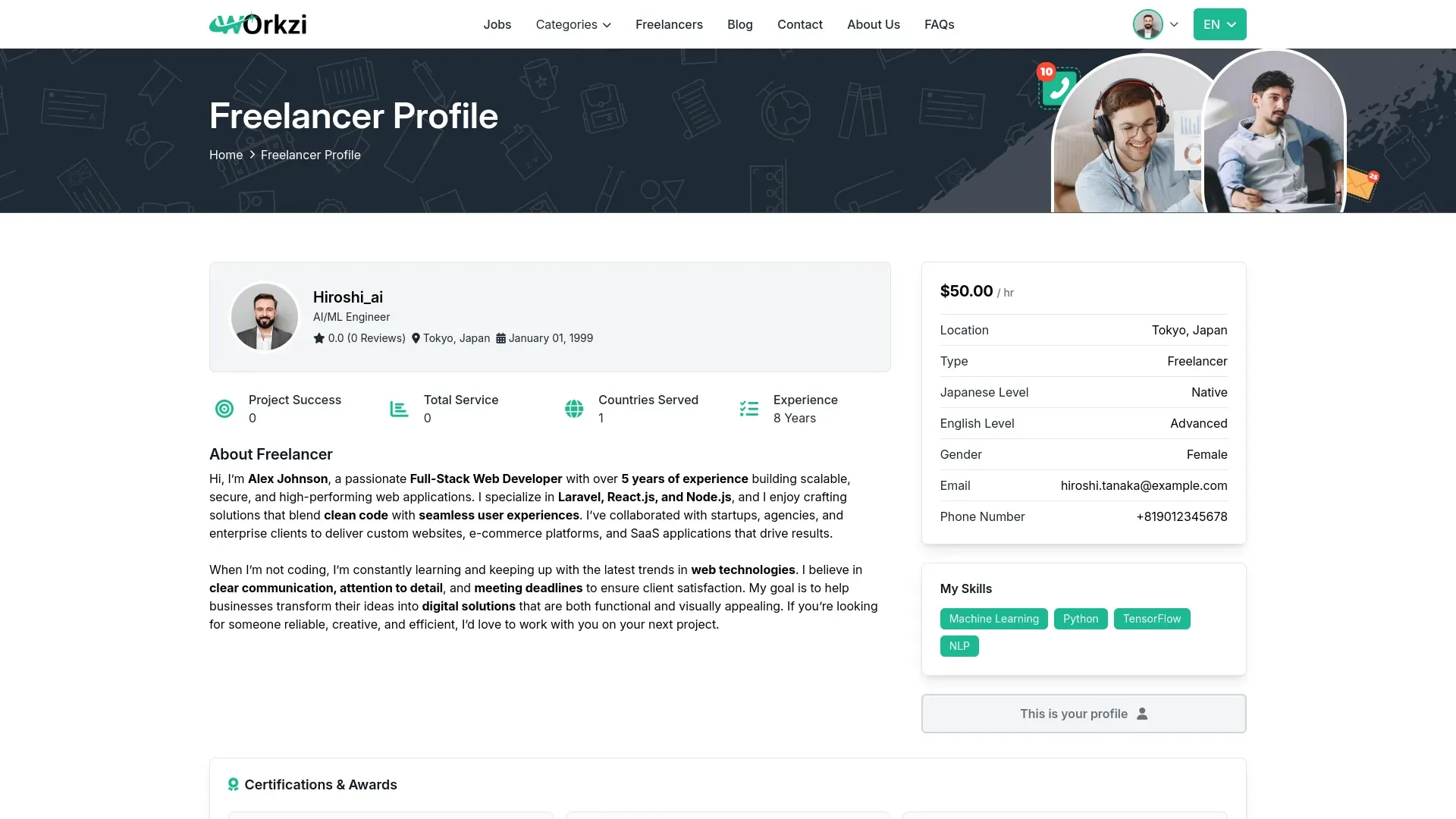 Complete user accounts for both freelancers and clients with detailed customization options. Freelancers can display their work samples, certificates, past projects, and answer common questions. The system tracks work experience, skills, education, and language abilities. Location features with full address details help match local jobs and filter by geography for better project fit.