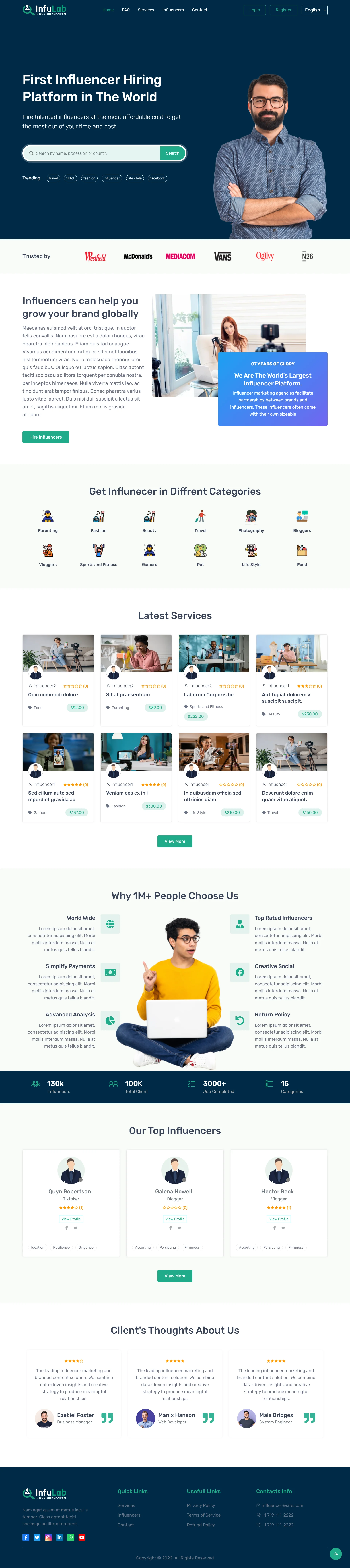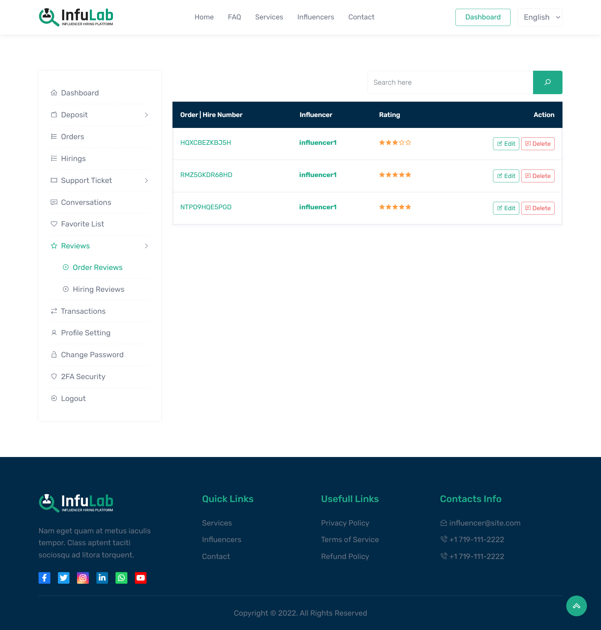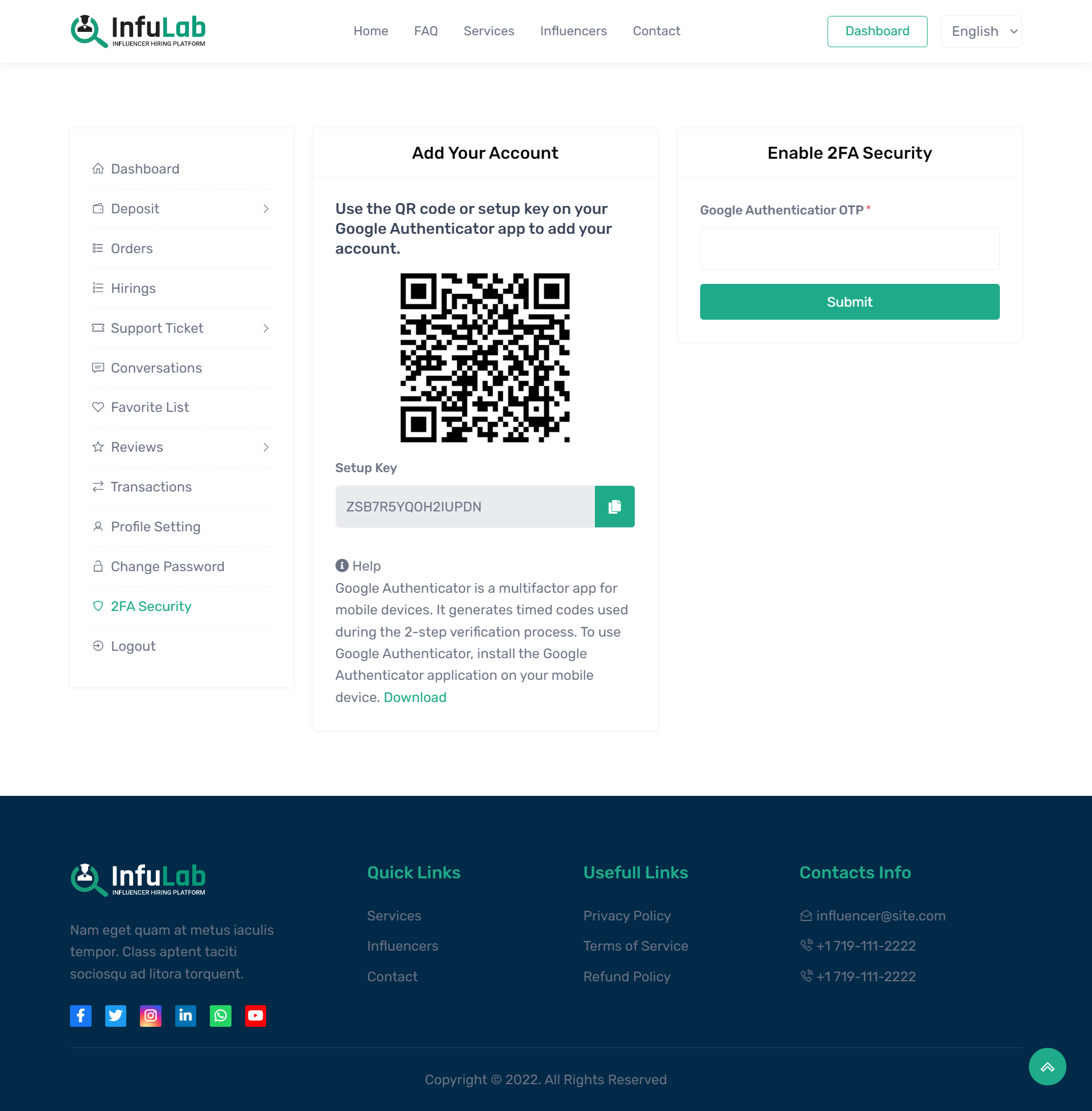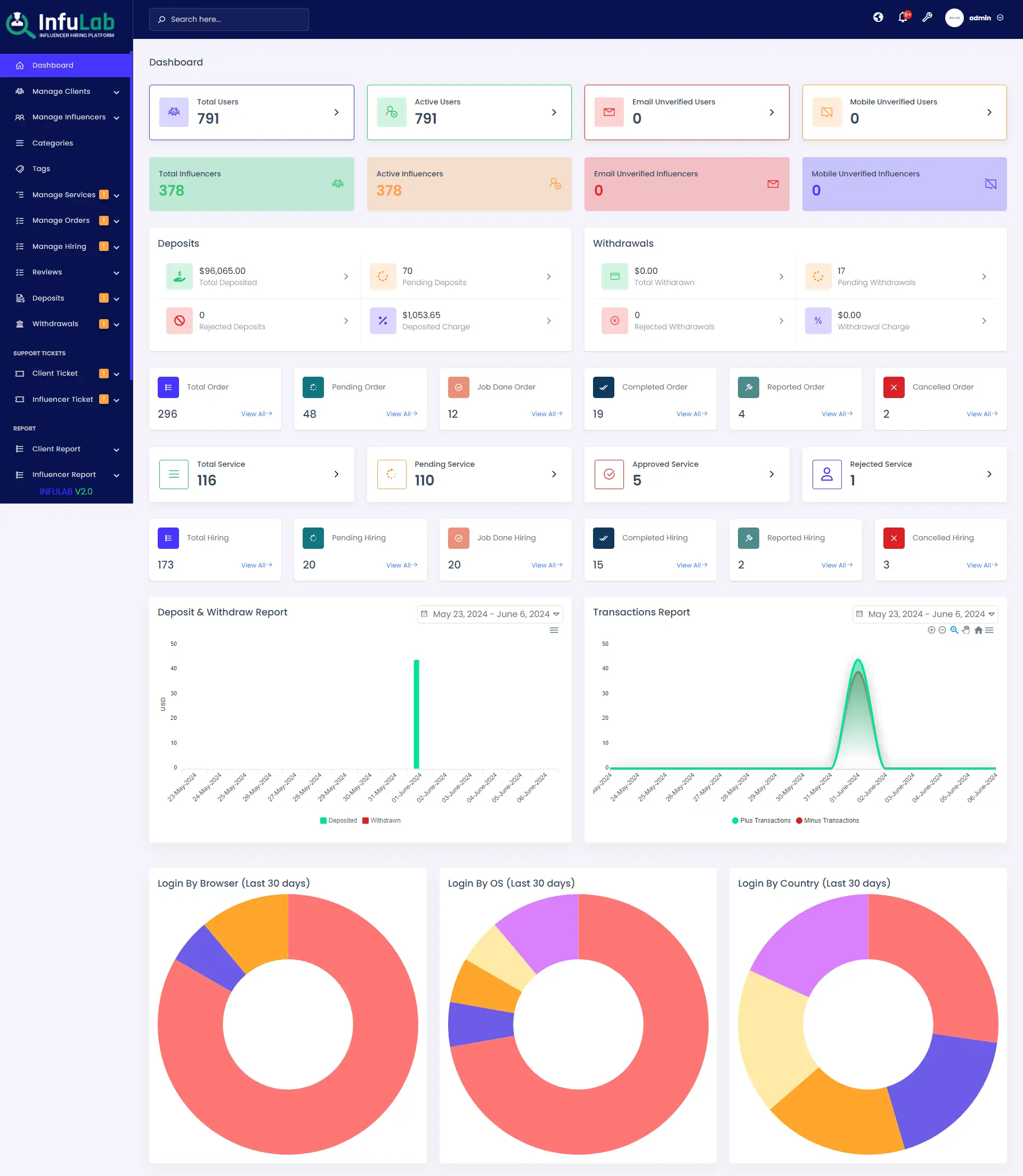 InfuLab is a professional Influencer Hiring System built with PHP Laravel, designed for those looking to launch their own influencer hiring business website. As the influencer marketing industry continues its strong growth, InfuLab offers a seamless solution to connect clients with influencers. Customers can easily access the platform, deposit funds through 30+ automated and unlimited manual payment methods, and hire influencers for various tasks. Influencers can withdraw their earnings after task completion using their preferred payment methods. The system supports unlimited users, influencers, transactions, deposits, withdrawals, and KYC processes, and accepts payments via cards, cryptocurrencies, and mobile money. With its ready-to-go setup, InfuLab allows you to get your website up and running within minutes, supported by professional installation and assistance. Get your copy today and start building your influencer hiring platform with confidence.