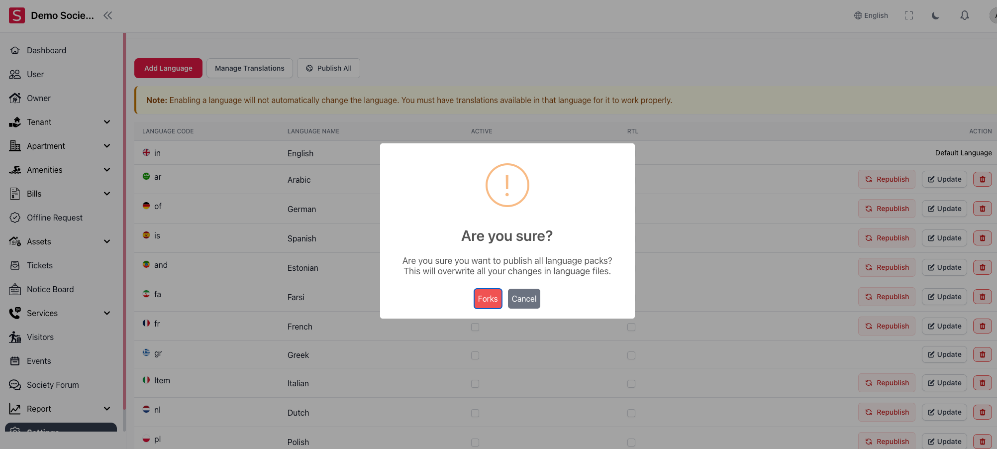The Language Pack Module enables SocietyPro to support multiple languages, letting users interact with the platform, notifications, and emails in their preferred language. This ensures a global-friendly, inclusive SaaS experience for societies, communities, and residential users.