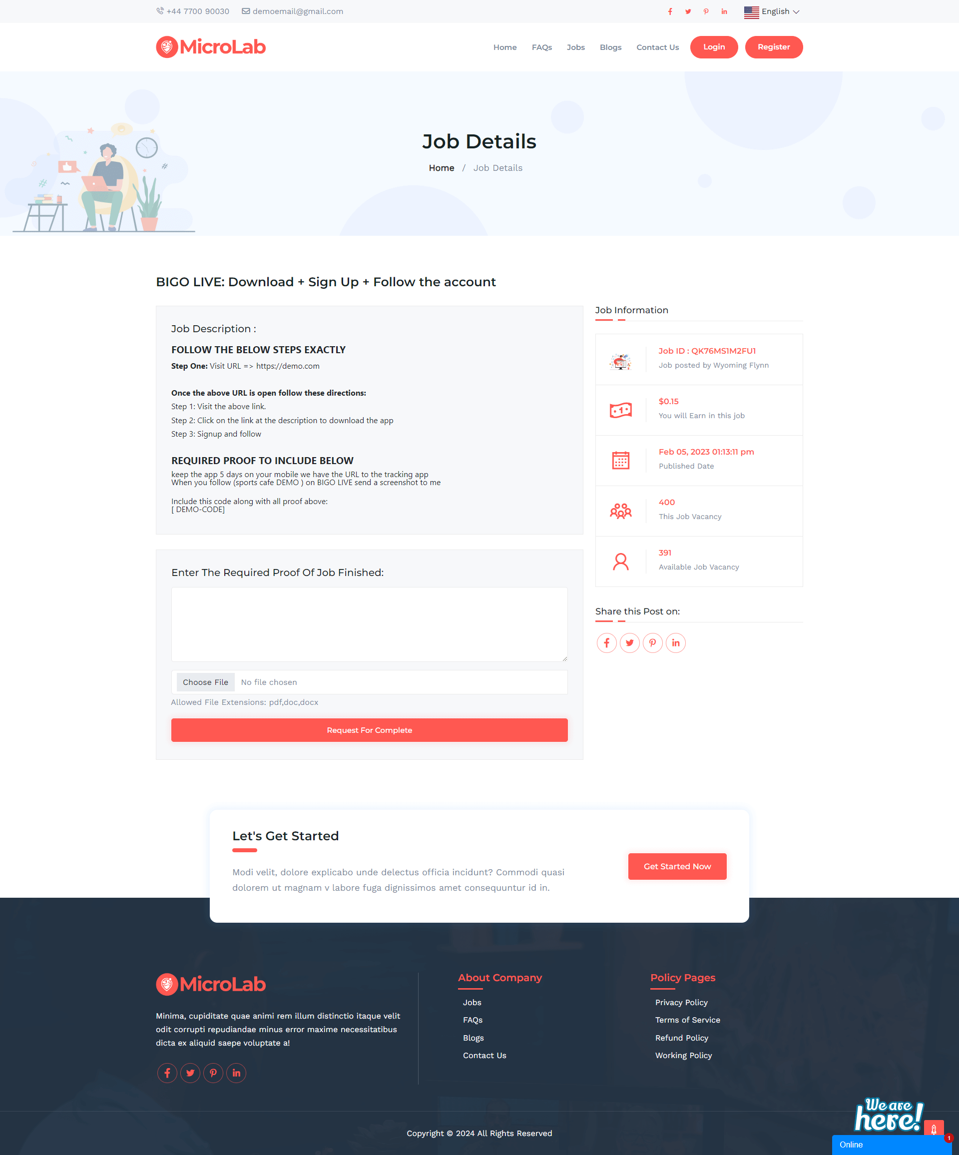 MicroLab is a micro job freelancing platform that connects freelancers with clients for small, task-based projects. Users can offer skills, complete gigs, and earn quickly, while businesses and individuals can get tasks done efficiently at competitive rates. Ideal for freelancers looking to monetize skills and for clients seeking quick, reliable solutions.