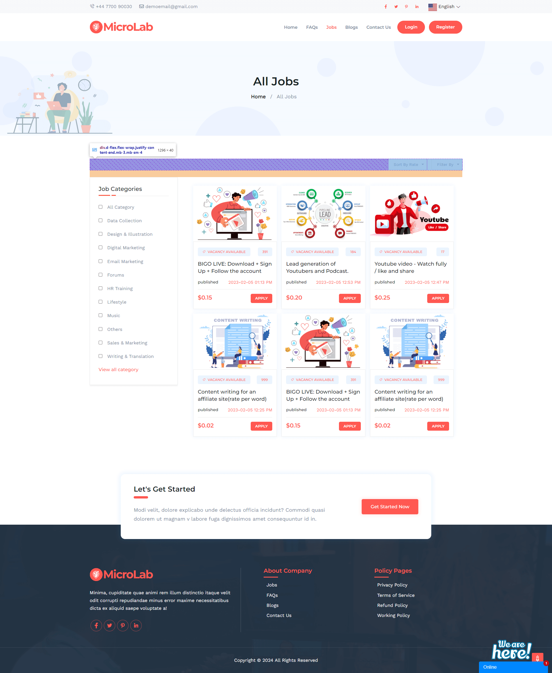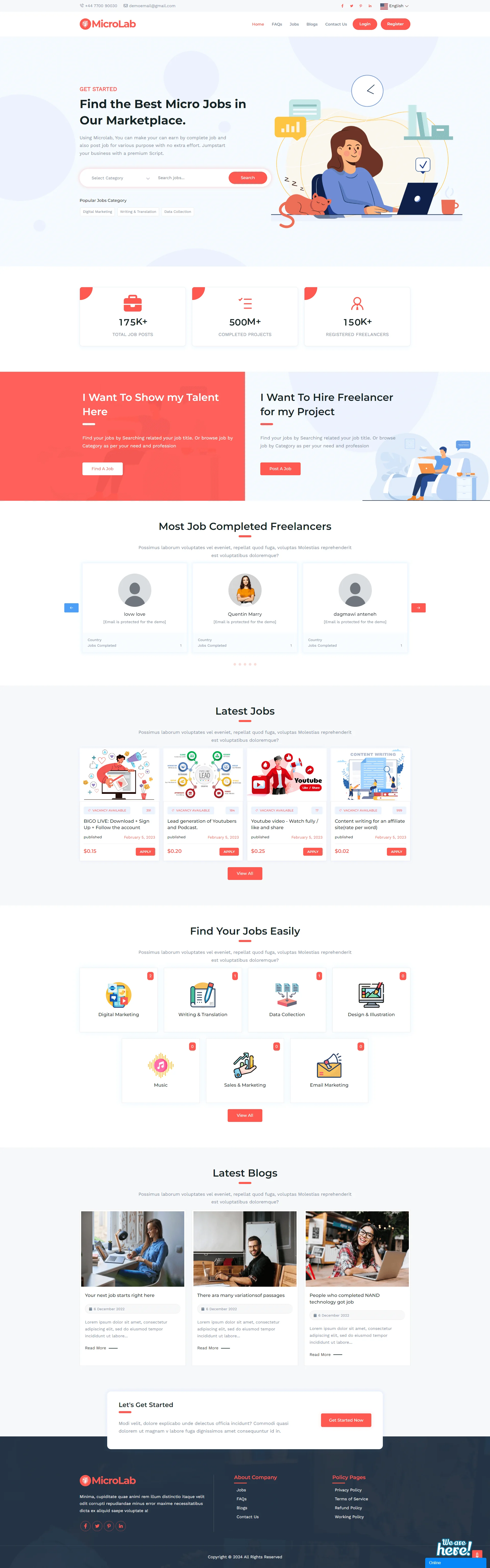 MicroLab is a professional micro freelancing marketplace platform packed with premium features designed to elevate your business. Perfect for entrepreneurs looking to launch their own micro freelancing marketplace, MicroLab allows you to effortlessly manage unlimited users, orders, services, categories, digital jobs, freelancers, and buyers. The platform supports payments through cards, cryptocurrencies, and mobile money, and comes with a fully responsive design, a powerful admin panel, and an intuitive user interface. With this ready-to-go solution, you can set up your website in just minutes—no need to spend thousands on custom development. Get your copy today and launch your own microjobs marketplace with ease!