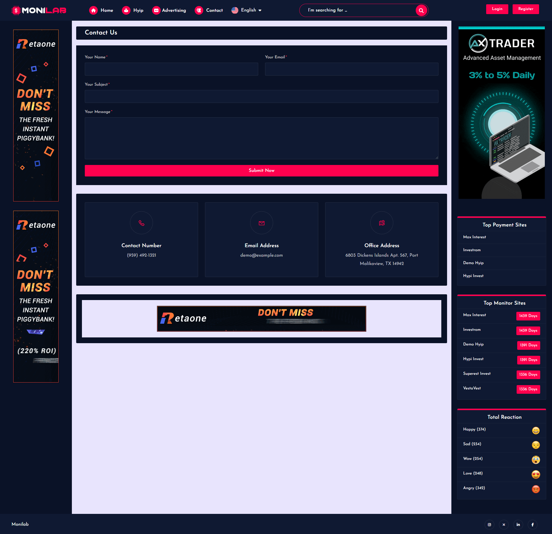 Need a simple, dark, premium and powerful HYIP listing or monitoring website. No need to pay thousands of dollars to hire developers to build your HYIP Monitoring website. MoniLab may assist you to handle unlimited users, Listing, reviews, Votes, Advertisements, Reactions, and more. we include a report system to have more efficiency. it takes only a few minutes to set up your website with our system. we also here to provide you best support, installation, and customization if you need it.