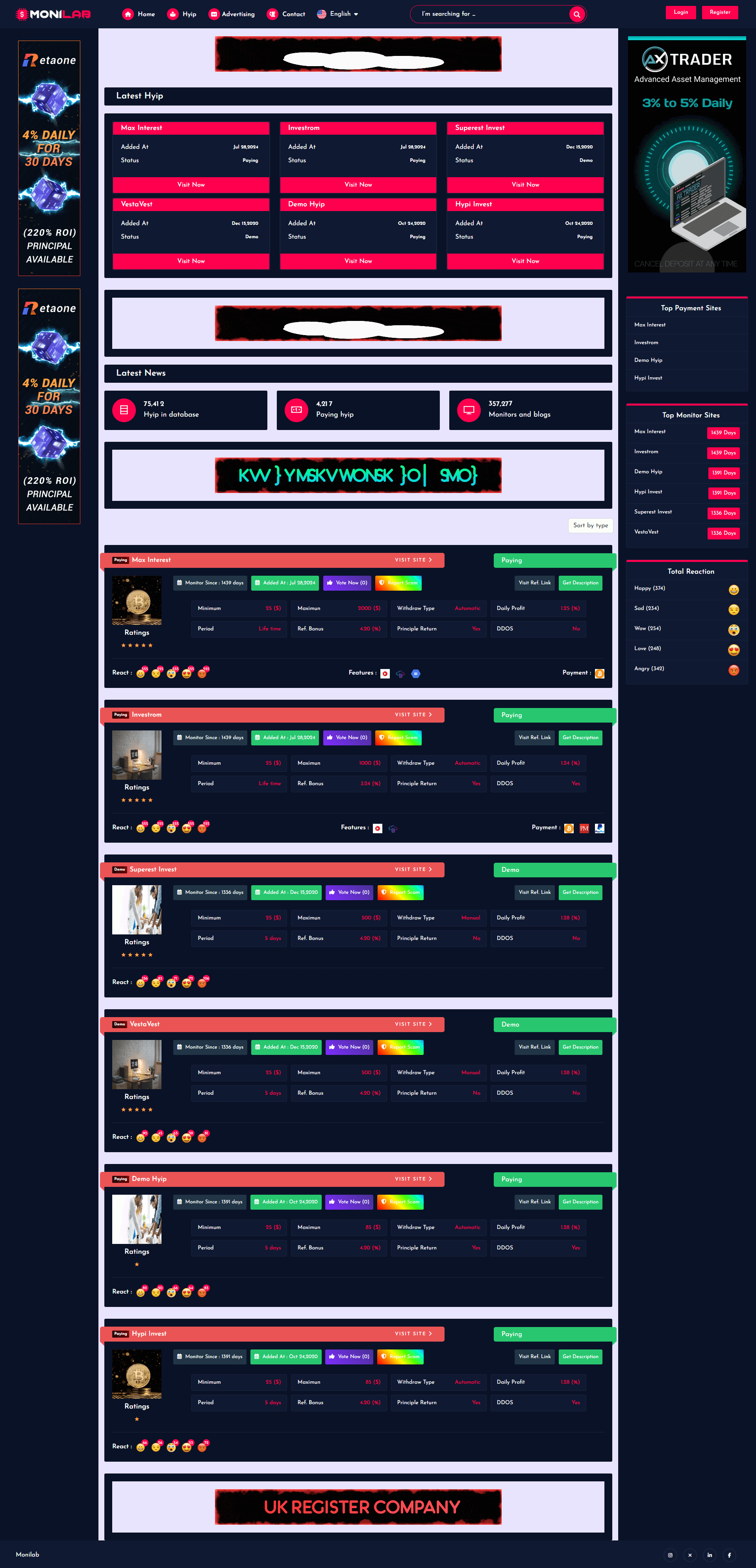 MoniLab is a specialized HYIP (High-Yield Investment Program) monitoring platform designed to provide investors with accurate, real-time information about various investment programs. It serves as a trusted resource for tracking, analyzing, and evaluating HYIPs, helping users make informed investment decisions.