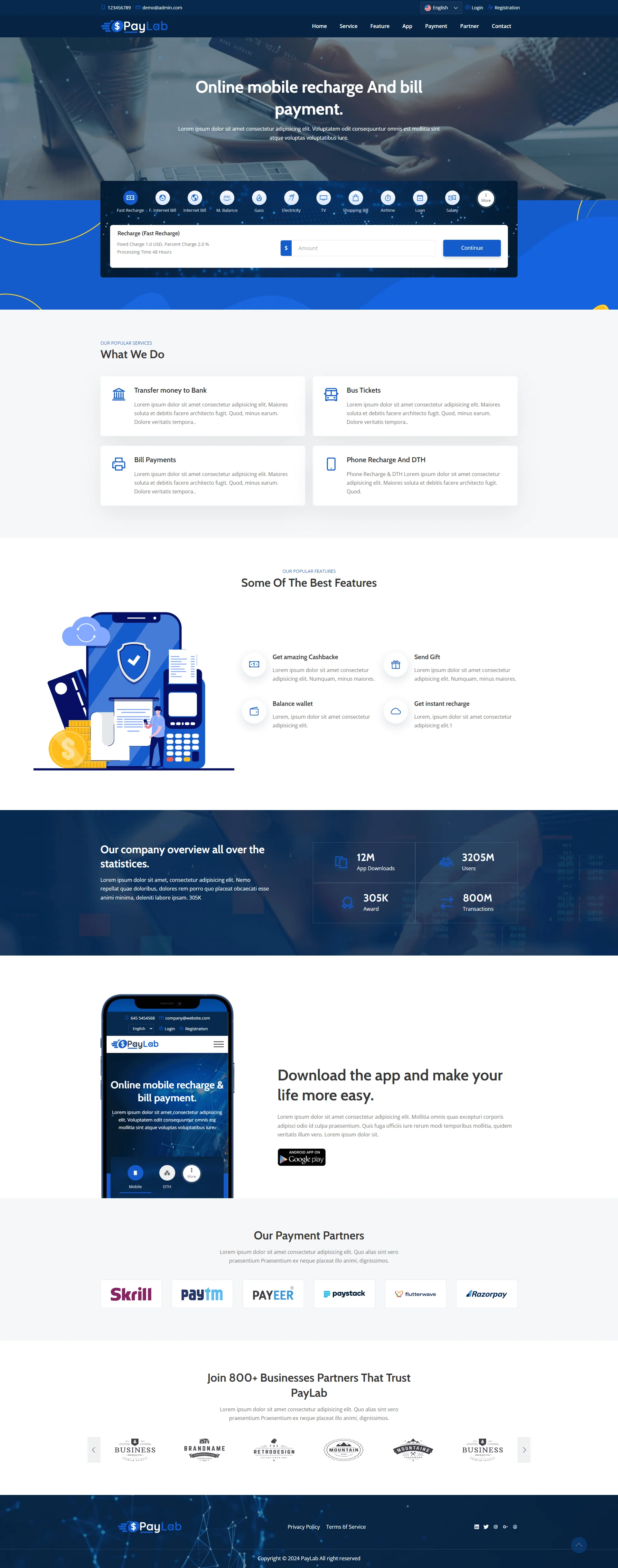 With PayLab, users can recharge prepaid and postpaid mobile numbers, pay electricity, water, gas, and internet bills, and access transaction history for easy tracking. The platform supports multiple payment options, instant confirmations, and automated reminders, making bill management simple and reliable.