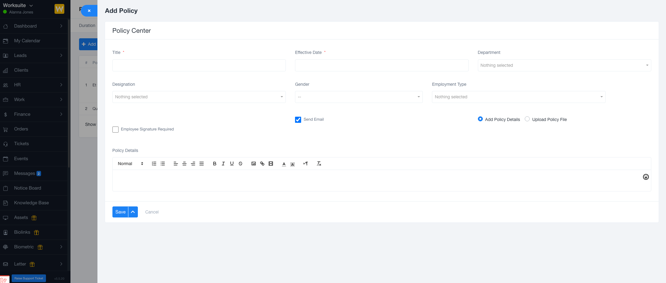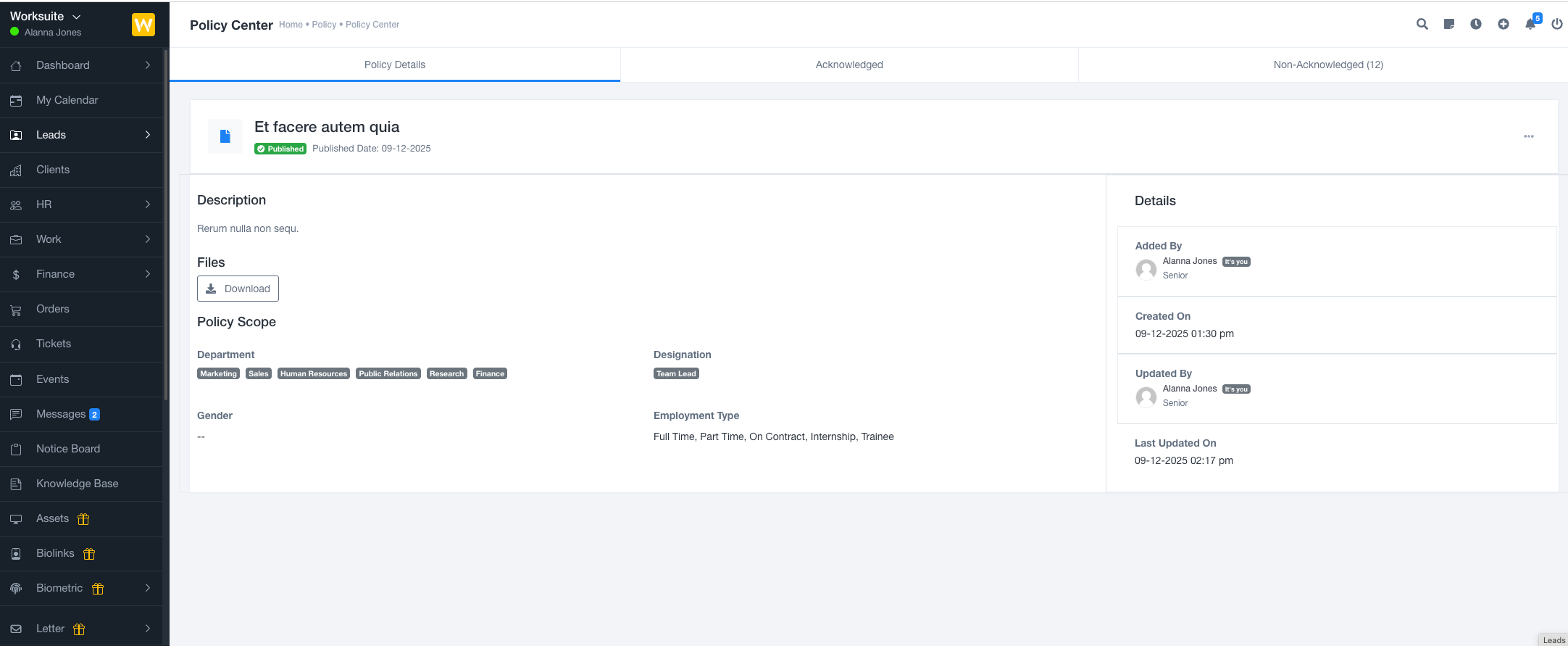 Note: Policy is an add-on module and must be integrated with your existing Worksuite application. Please verify compatibility with your Worksuite version before installation.
