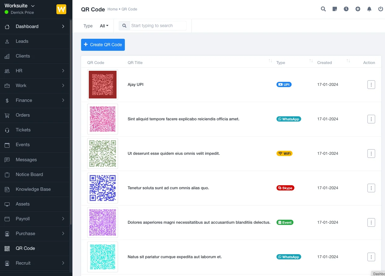 The QR Code Module is an integrated feature within Worksuite SaaS that enables users to generate and scan QR codes for invoices, tasks, projects, attendance, and client information. This module simplifies operations, enhances mobility, and ensures secure, instant access to data across the platform.