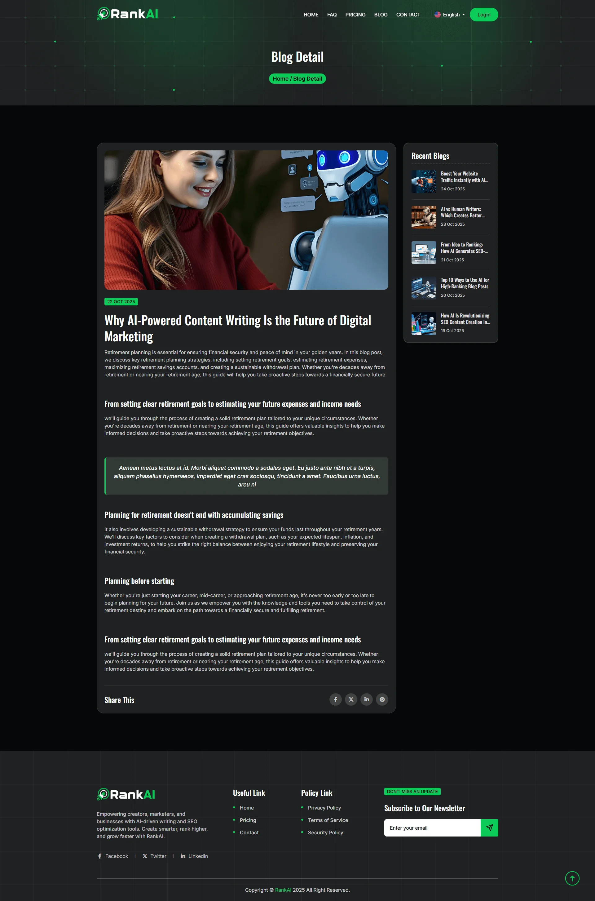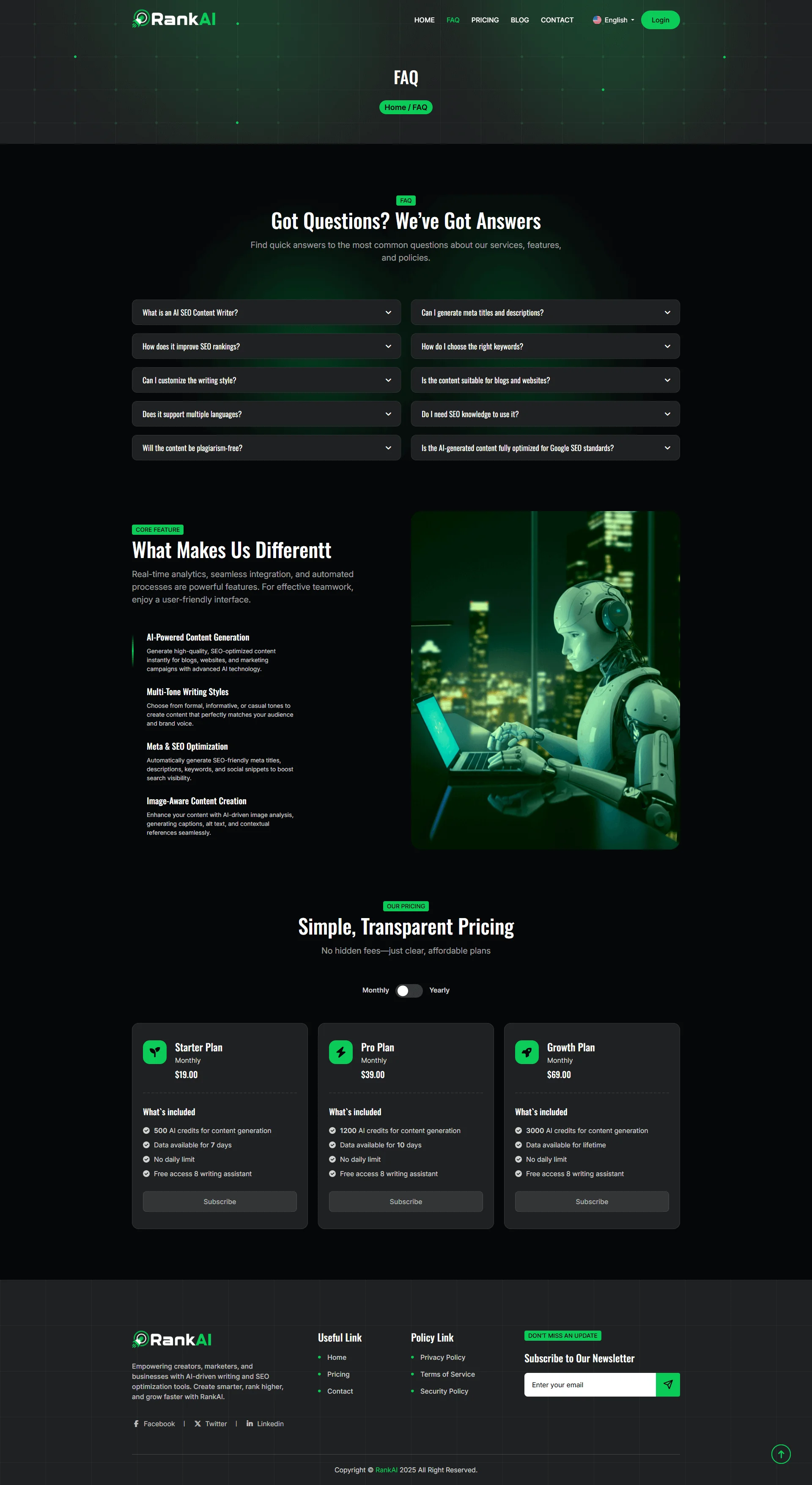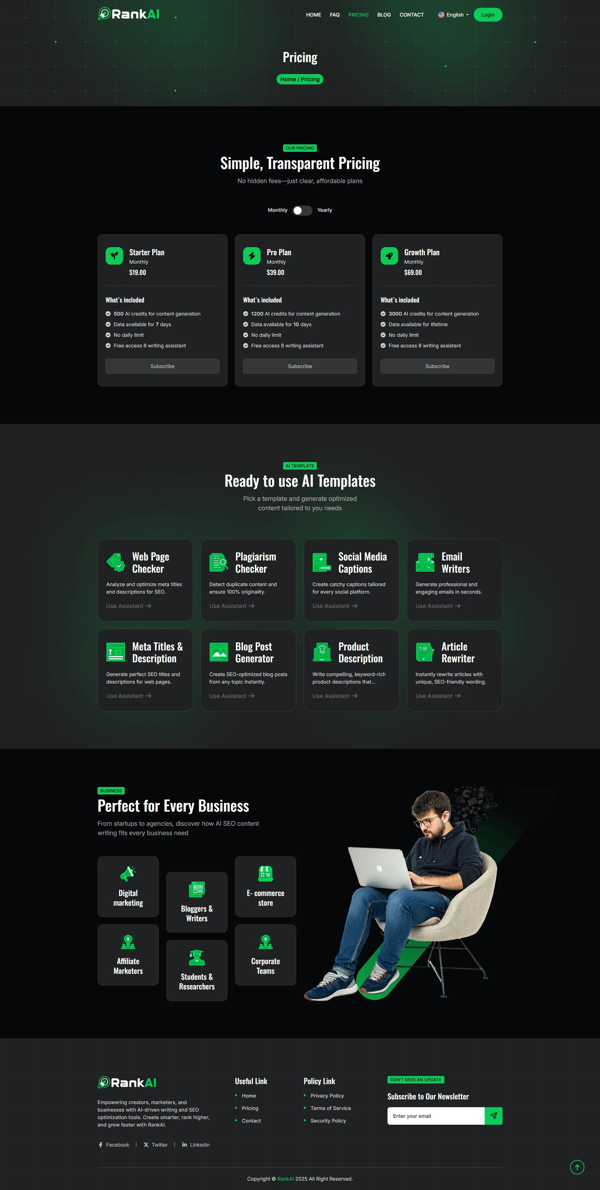 We value your money, and we know hiring a content writer and managing them is so costly, but now you don’t need to pay thousands of dollars for your content and a content writer. Our Solution can save your time, space, and money. No Monthly Fees, No Hidden Charges! Own a powerful, feature-rich AI writing and SEO content optimization platform for a one-time, affordable payment for a lifetime. No recurring fees, no encrypted limitations.RankAI comes as a SAAS (Software as a Service). Our platform supports multiple languages, natural design, and different styles. It’s scalable and comes with full source code; you can upgrade, downgrade, or add additional features easily.
