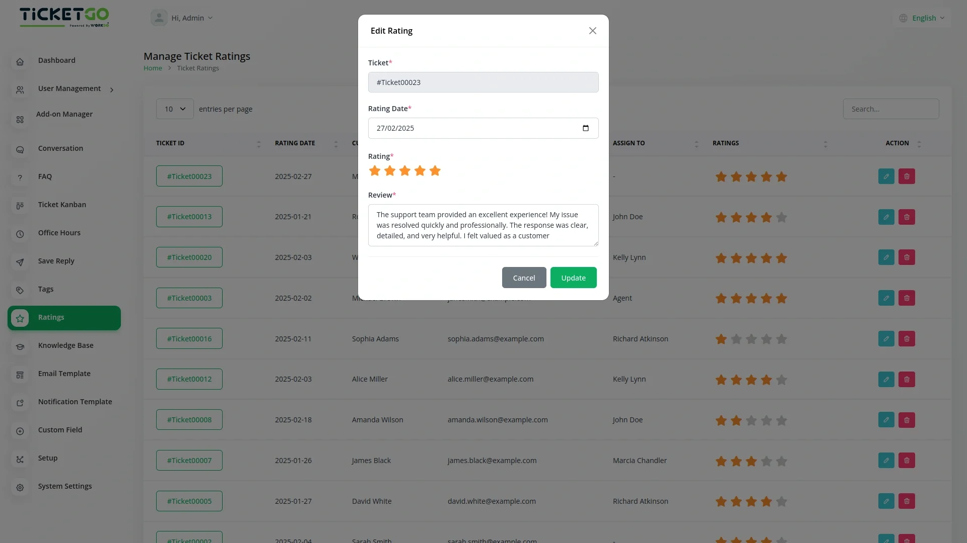 The Ratings Module in TicketGo makes it easy to gather valuable customer feedback. Once enabled, you can send automated rating requests to your customers, allowing you to collect insights at critical moments during the ticket process. This helps you understand customer satisfaction with minimal effort, streamlining feedback collection.
