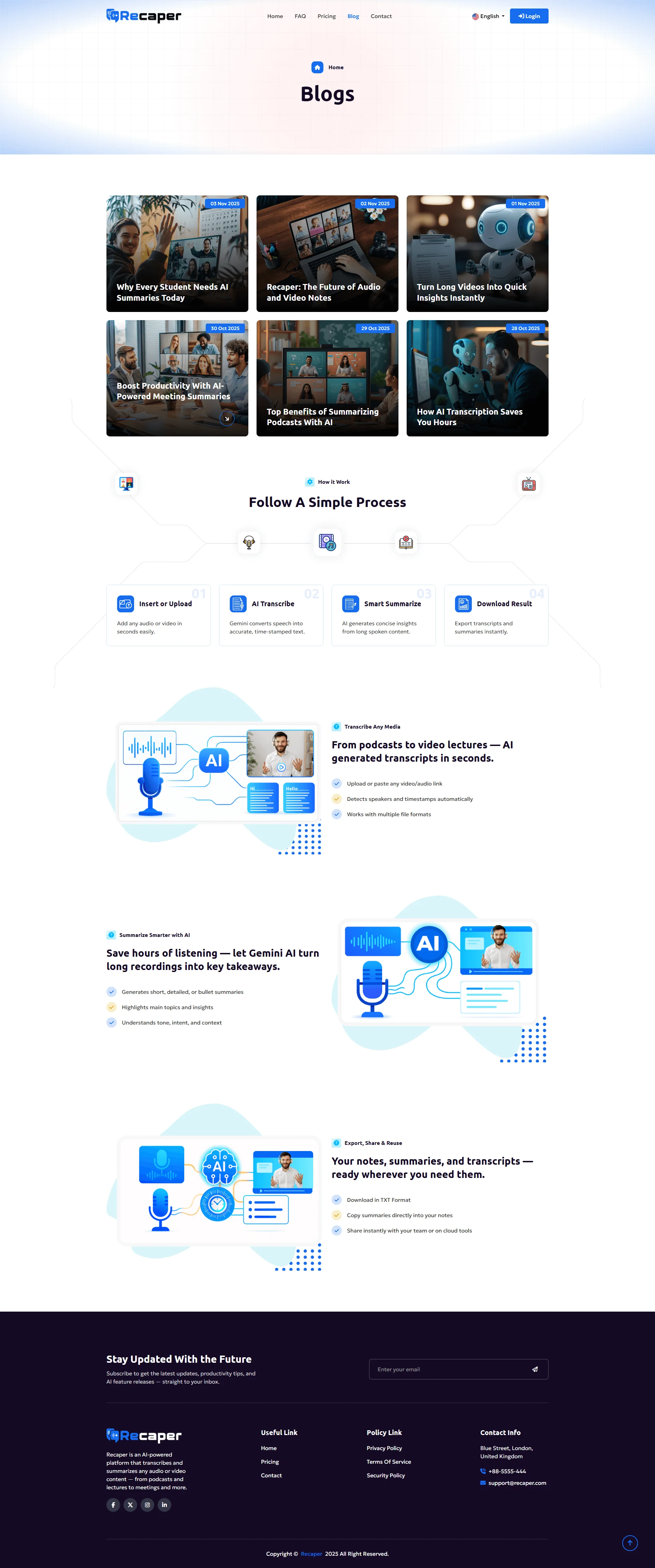 Recaper is an advanced AI-powered video and audio summarizer designed to instantly convert long recordings into clear, concise summaries, transcripts, highlights, and actionable notes. Built as a next-generation AI Notetaker SaaS, Recaper helps professionals, students, creators, and teams save hours by automatically processing podcasts, YouTube videos, lectures, Zoom meetings, interviews, and webinars.