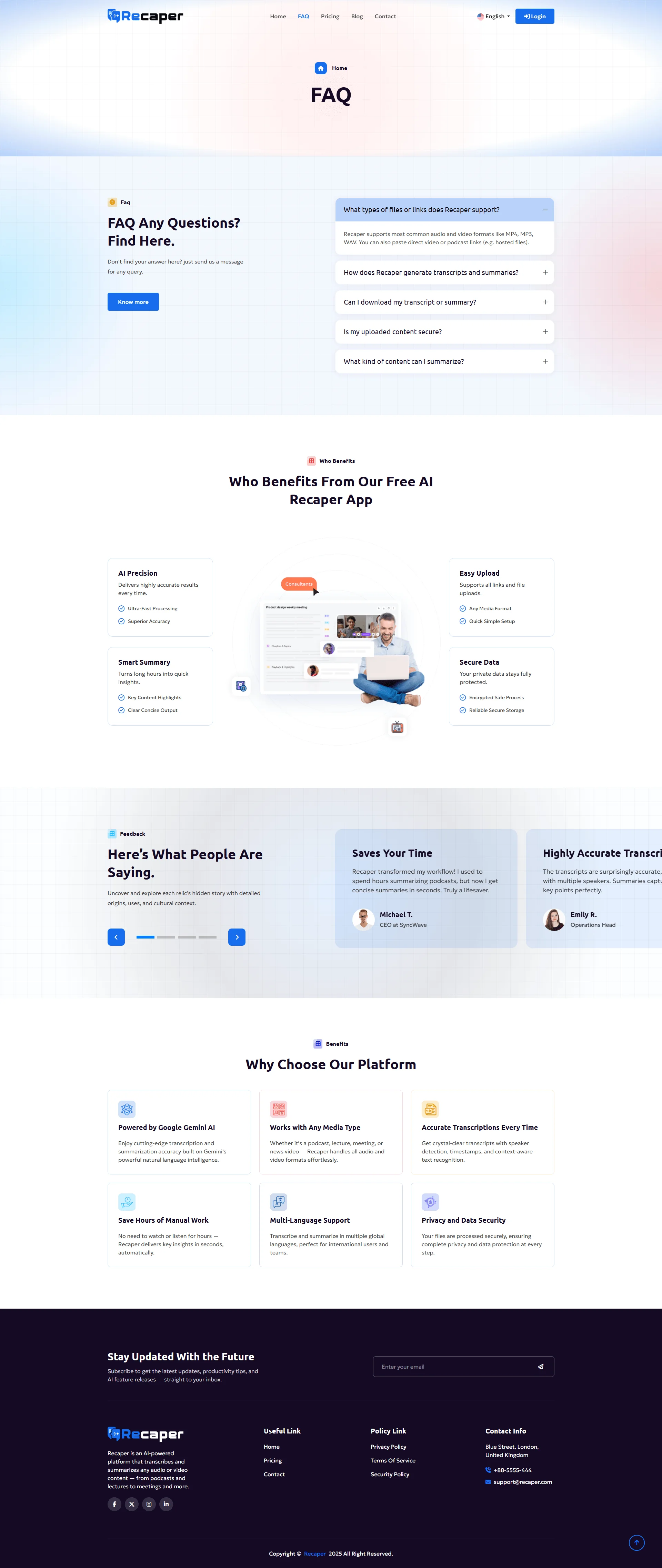 Recaper is an advanced AI-powered platform designed to automatically summarize, transcribe, and analyze your video and audio content in seconds. Whether you’re a content creator, student, podcaster, or business professional, Recaper helps you save hours of manual work by turning long recordings into concise, accurate, and easy-to-read summaries. With Recaper, you can upload or link to any video or audio file from any server. Use any videos, meetings, interviews, podcasts, webinars, or lectures, and instantly receive detailed transcripts, timestamps, and key takeaways powered by the latest AI and NLP (Natural Language Processing) technology. Our intelligent summarization engine captures important topics, speakers, emotions, and insights, allowing you to quickly understand any conversation or presentation without watching or listening to the entire content.