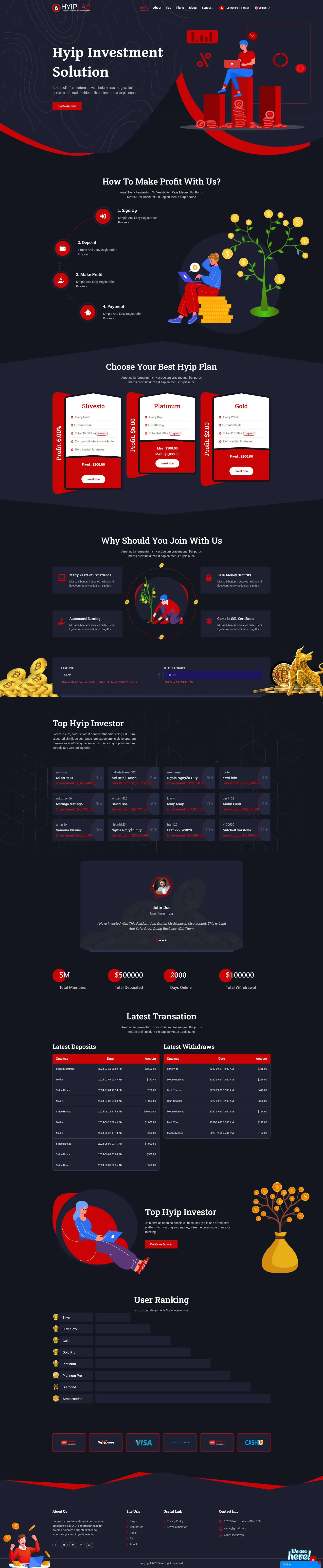 RedHyip is a modern, high-quality premium theme designed exclusively for HYIPLab, offering a sleek, stylish, and conversion-focused interface for High-Yield Investment Program platforms. Crafted with a bold red aesthetic, smooth UI elements, and fully responsive layouts, RedHyip enhances the user experience while giving your HYIP website a professional and trustworthy appearance.