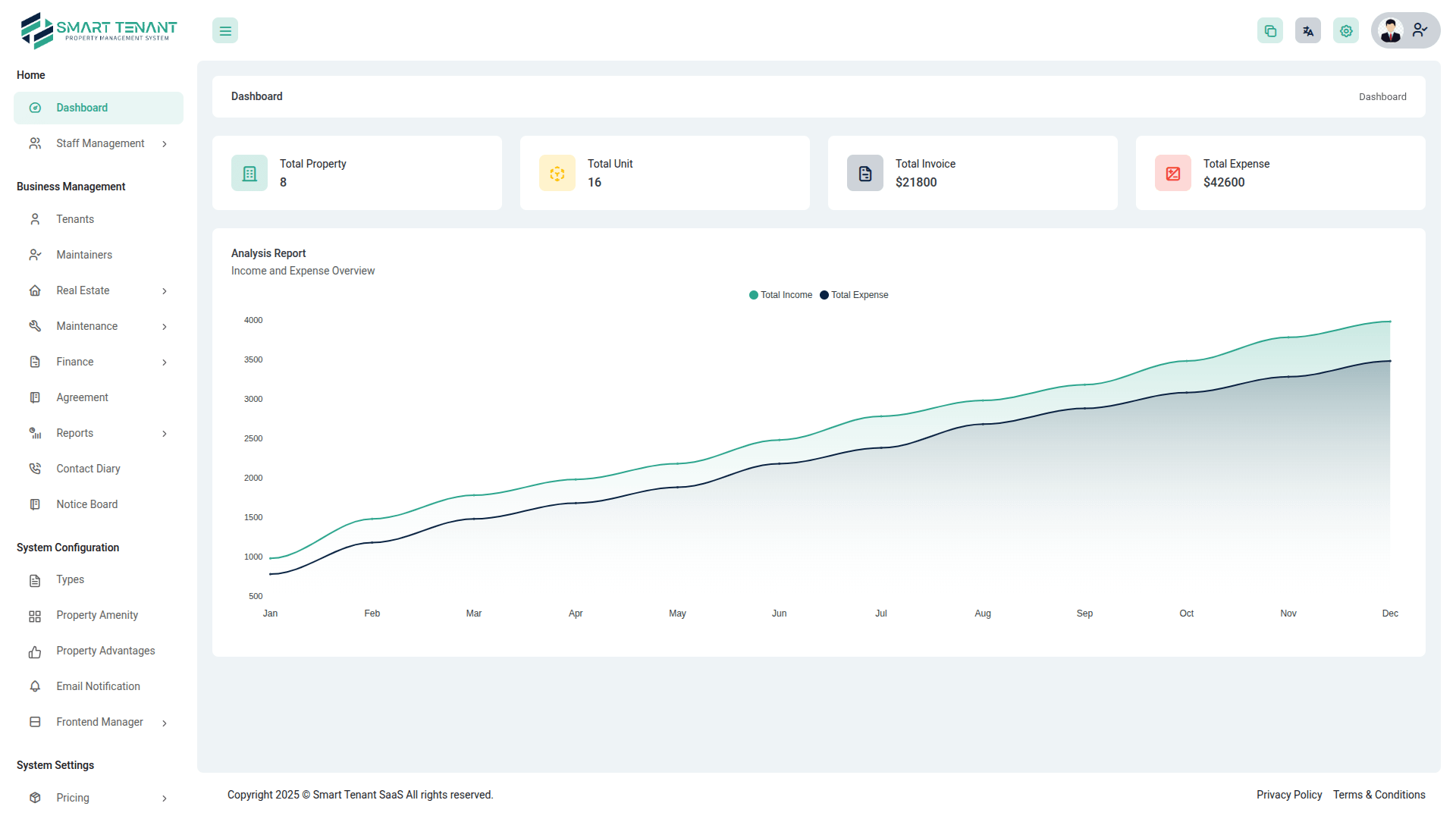 Smart Tenant is a powerful SaaS Property Management System designed for landlords, property managers, real estate agencies, and rental businesses. It simplifies the entire rental lifecycle — from tenant onboarding and lease management to rent collection, maintenance requests, and financial reporting.