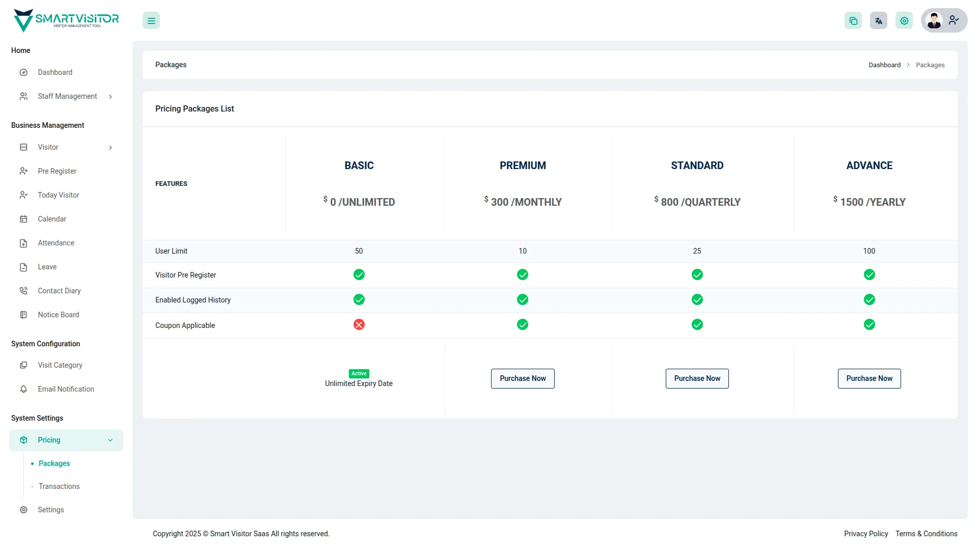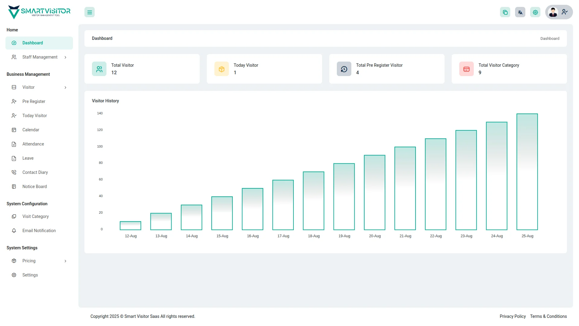 Smart Visitor is a robust SaaS Visitor Management Tool designed to streamline visitor registration, tracking, and security for organizations of all sizes. From reception check-ins to visitor approvals, access control, and reporting, Smart Visitor provides a centralized platform to manage every visitor interaction efficiently and securely.