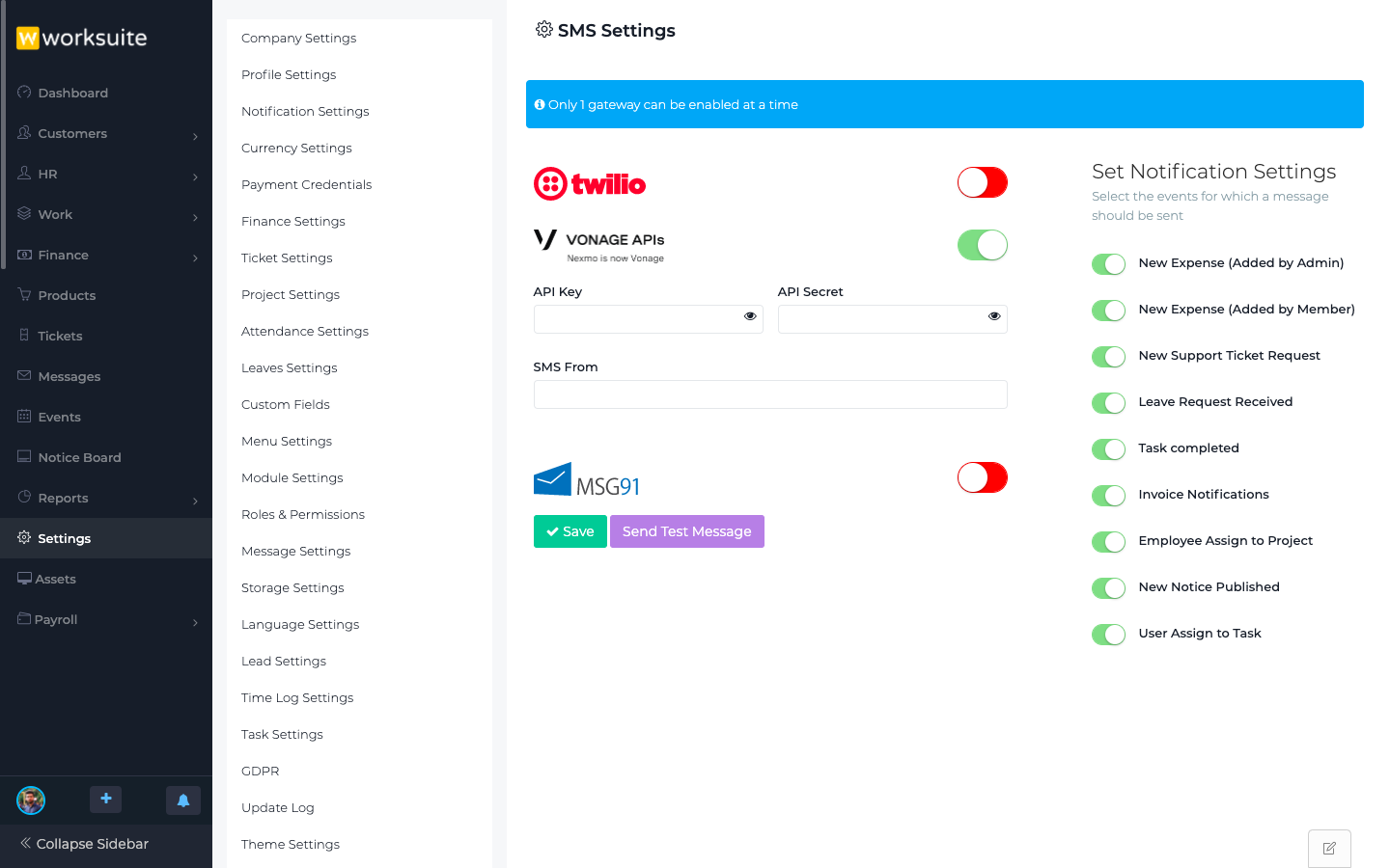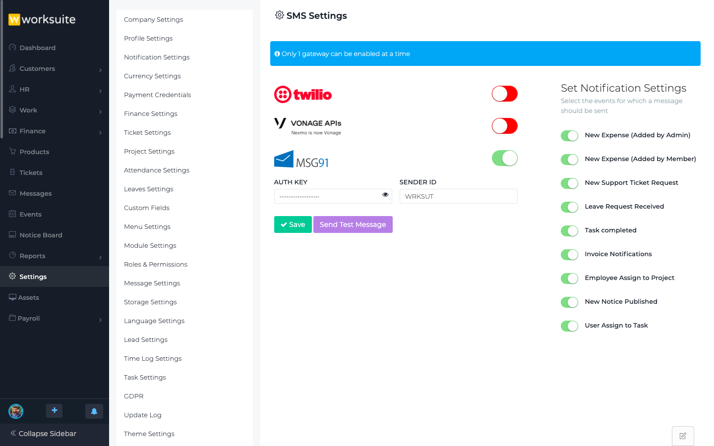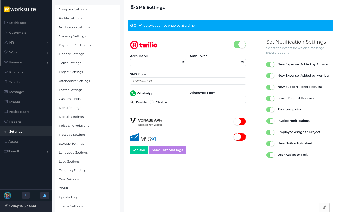 The SMS Module for WORKSUITE CRM enables businesses to send automated SMS notifications, reminders, and alerts directly from the CRM platform. It allows seamless communication with customers, leads, and employees for appointment reminders, payment notifications, marketing campaigns, and internal alerts. With features like bulk messaging, personalized templates, delivery tracking, and integration with CRM data, this module improves customer engagement, reduces manual follow-ups, and enhances overall business communication efficiency.