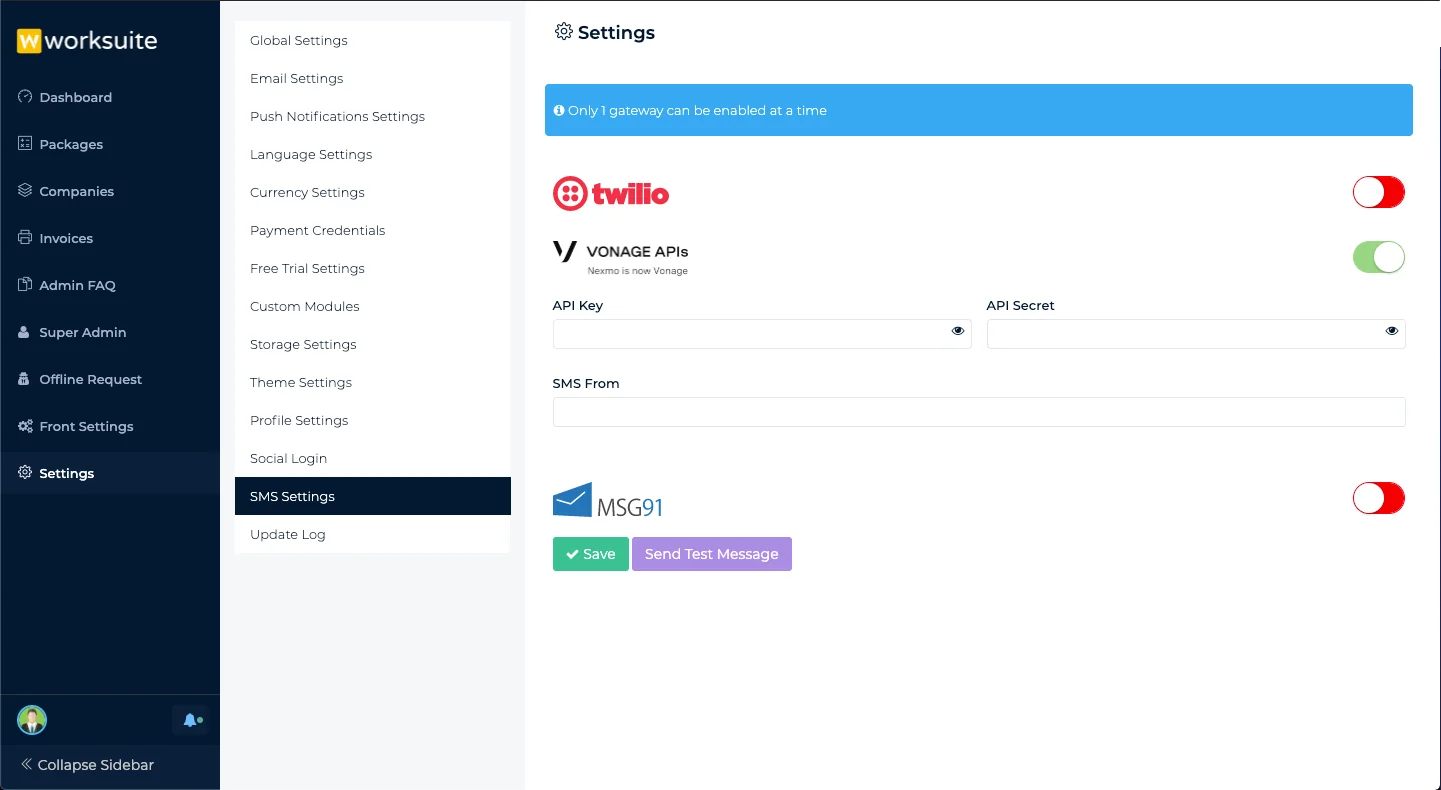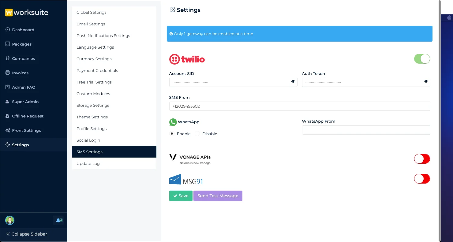 The SMS Module for WORKSUITE SaaS enables businesses to send automated SMS notifications, reminders, and alerts directly from the cloud-based platform. It allows organizations to communicate with clients, leads, employees, and teams for appointment reminders, payment notifications, marketing campaigns, and internal alerts. With features like bulk SMS sending, personalized message templates, delivery tracking, and integration with CRM, HR, and project modules, this module enhances customer engagement, workflow efficiency, and real-time communication across the organization.