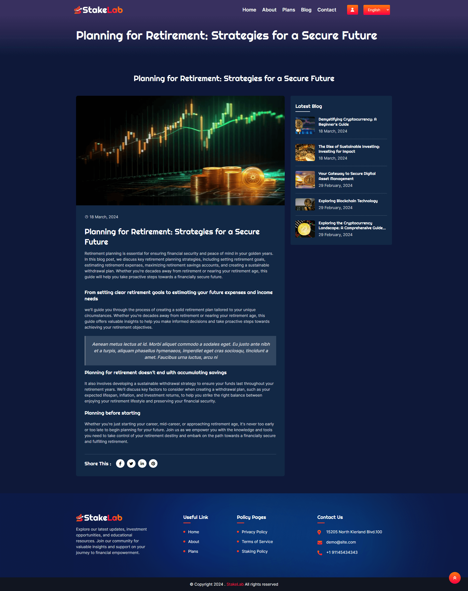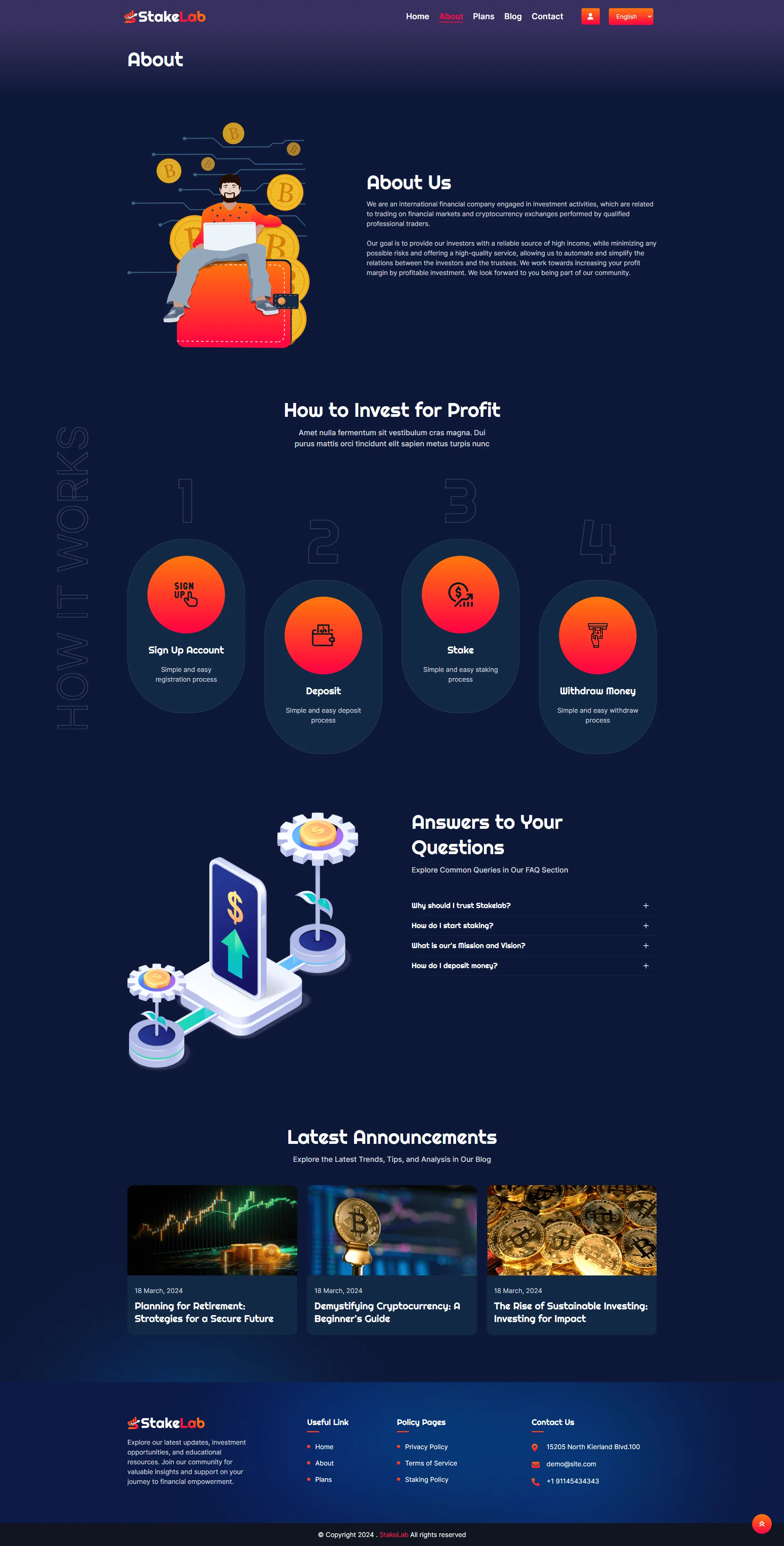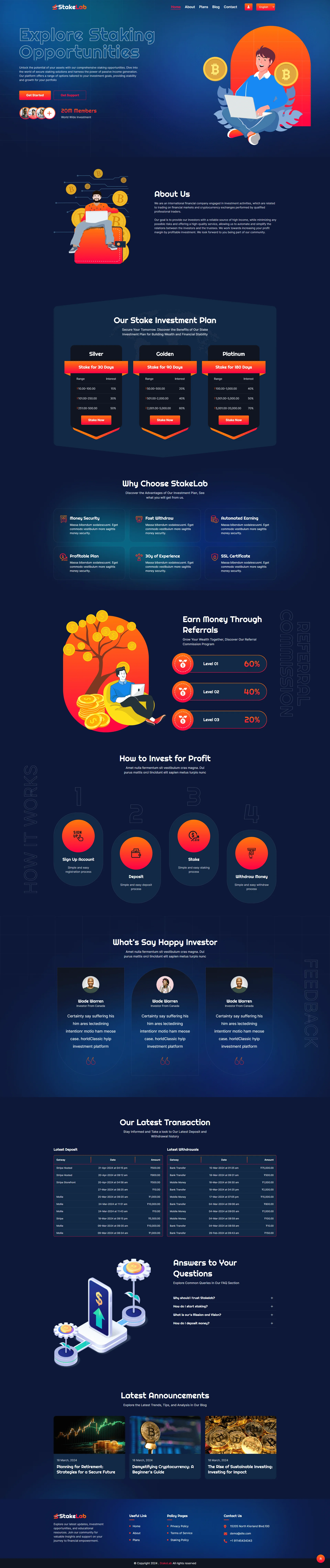 Cryptocurrency has revolutionized the world of investing with its potential for high returns and disruptive technology. Within the realm of crypto investment strategies, staking has emerged as a safe and profitable option. Welcome to StakeLab, a revolutionary system that comes with almost all the features needed to run your own staking business. StakeLab will help you to start your own staking website without any programming knowledge. Instant trade, buy, sell, 2FA security, SMS & Email notifications, market rates, profits-based plans, and many more come with StakeLab.