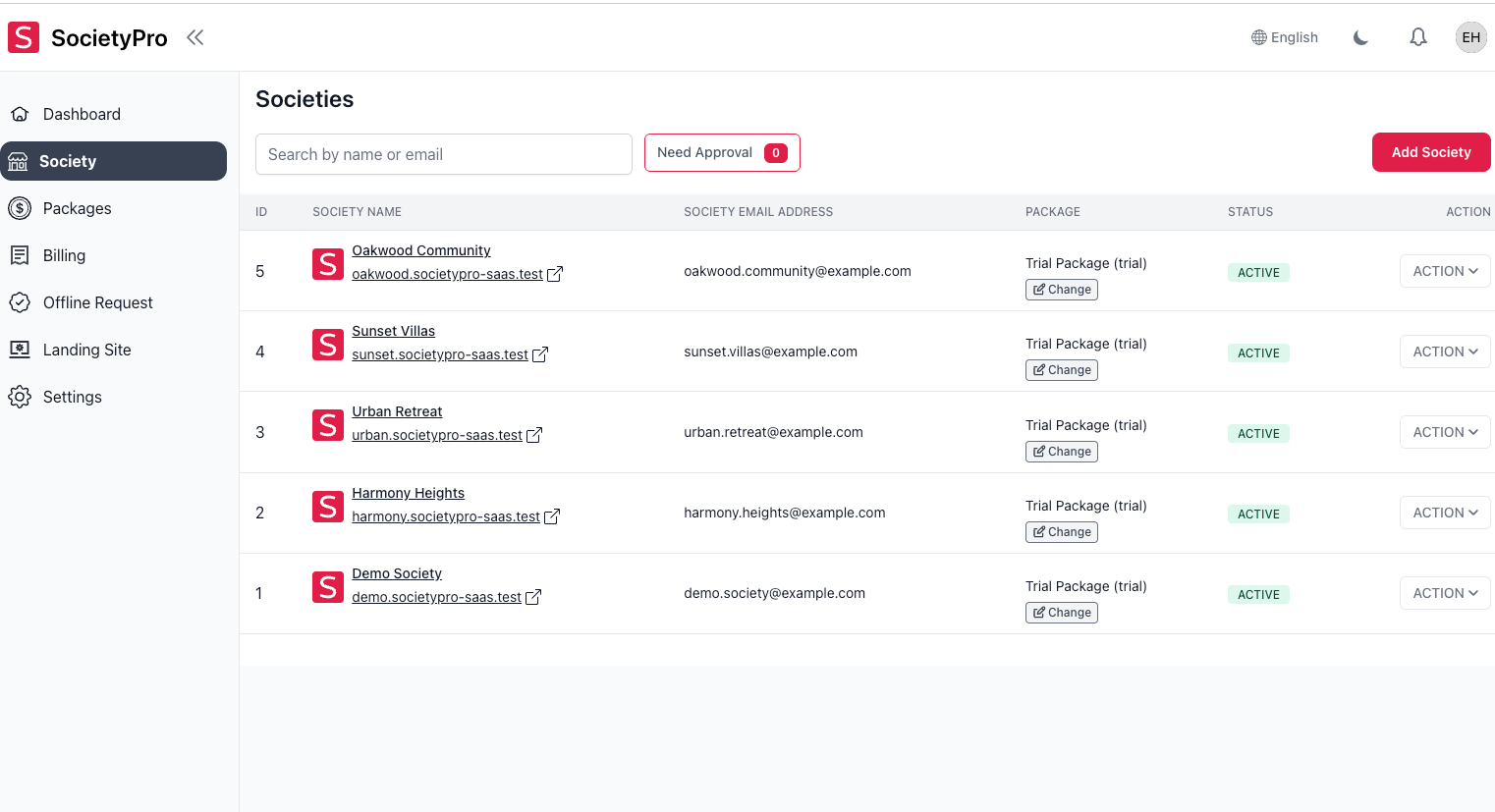 This module enables societies to have their own dedicated subdomains and custom domain names. For example: firstsociety.societypro.biz, secondsociety.societypro.biz, froiden.societypro.biz, society.yourdomain.com