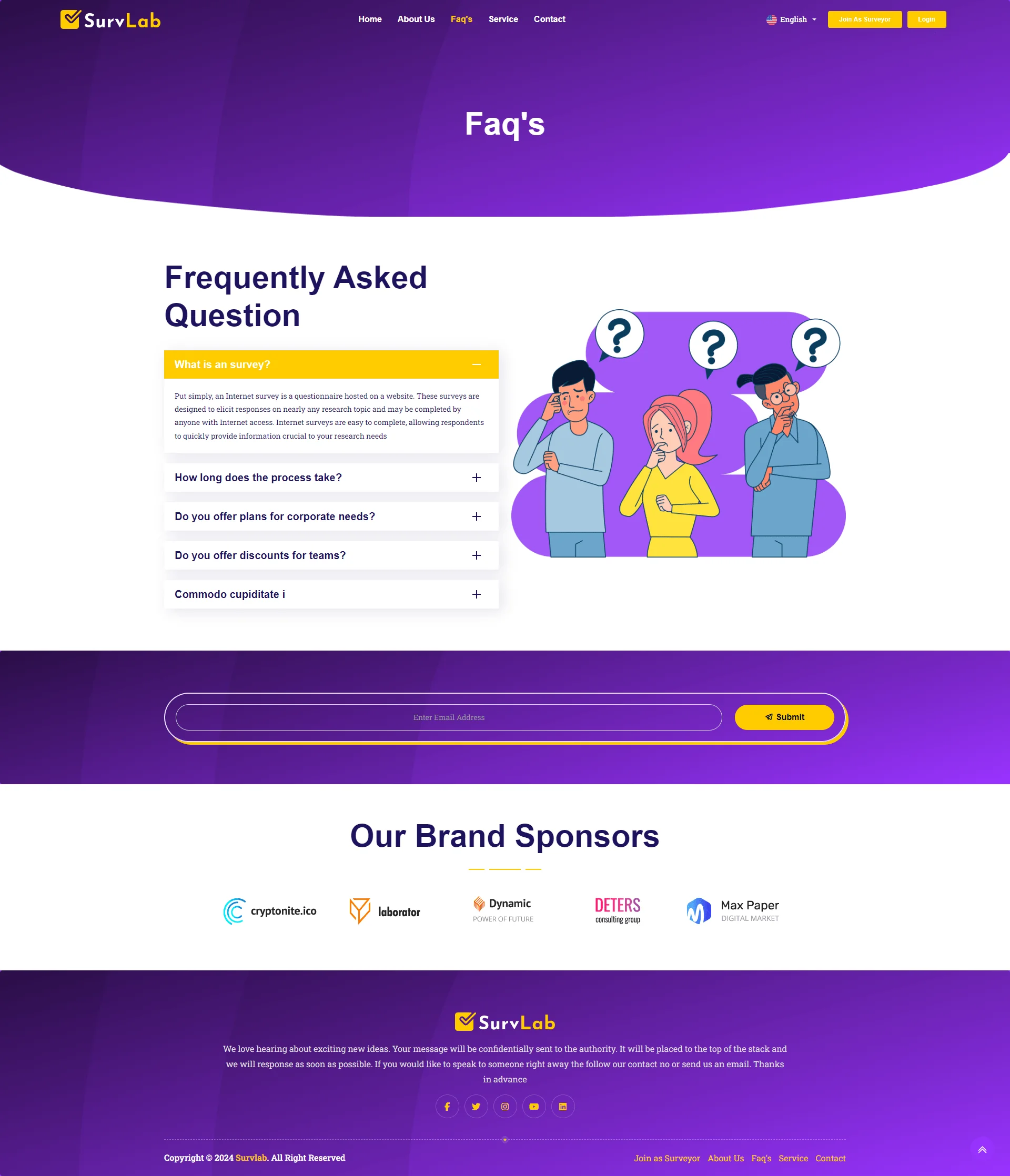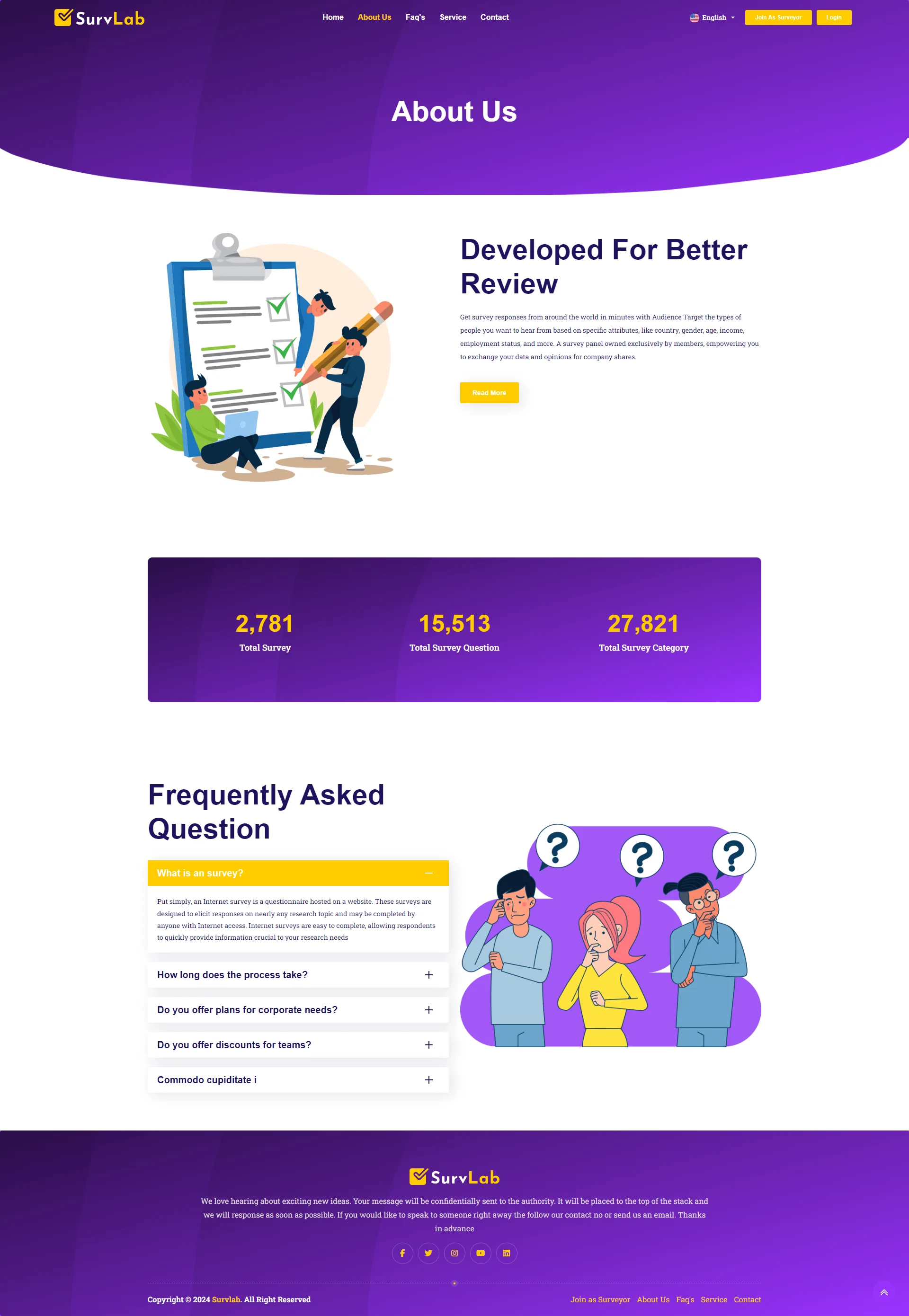 SurvLab is a user-friendly and straightforward survey application with dynamic frontend and backend features. It is highly secure, responsive, and clean, making it easy to use. The platform includes separate panels for surveyors and users, each offering unique facilities. Additionally, it supports numerous payment gateways, an easy-to-manage admin panel, an SEO manager, and various plugins for an enhanced contextual frontend experience.