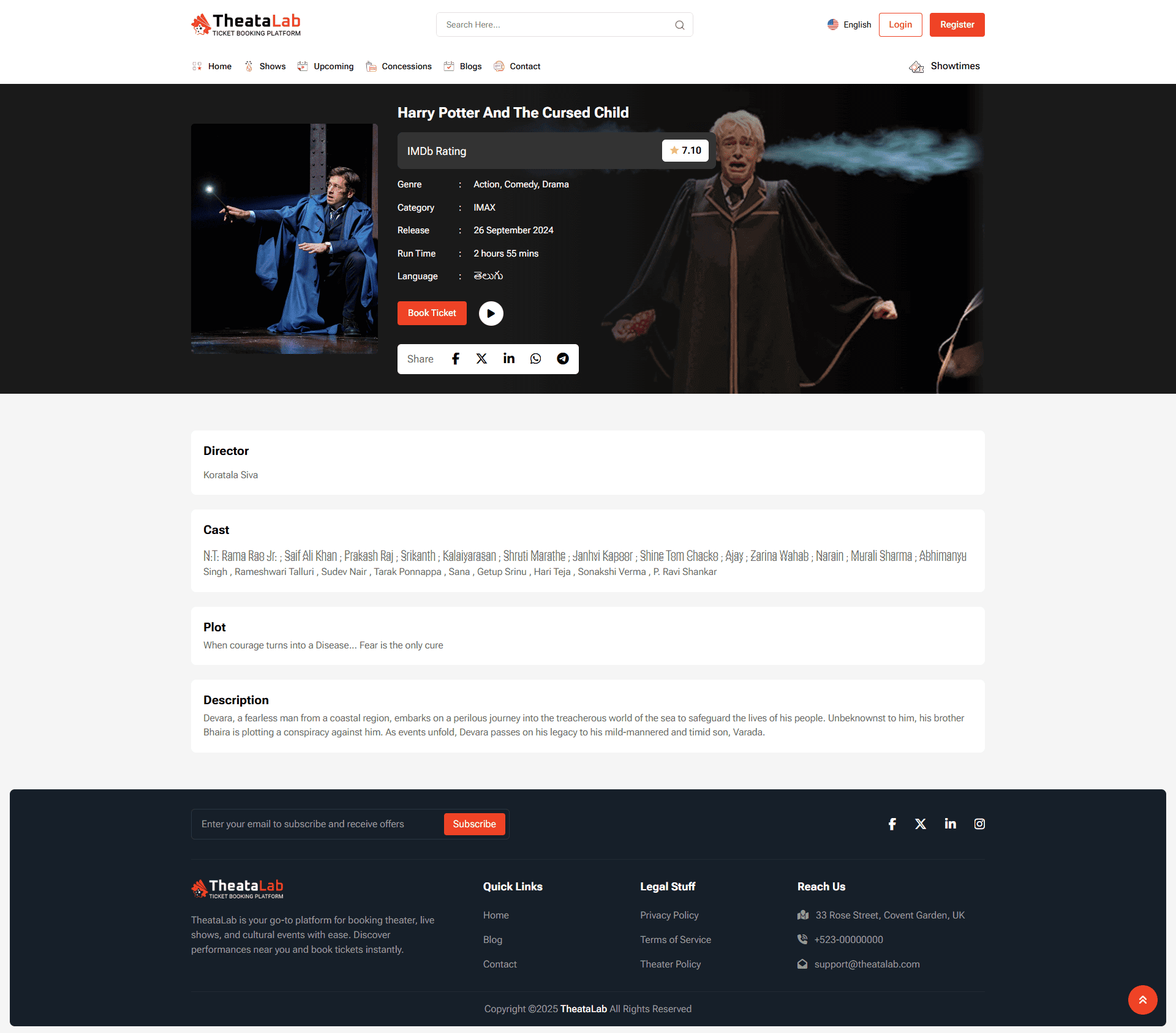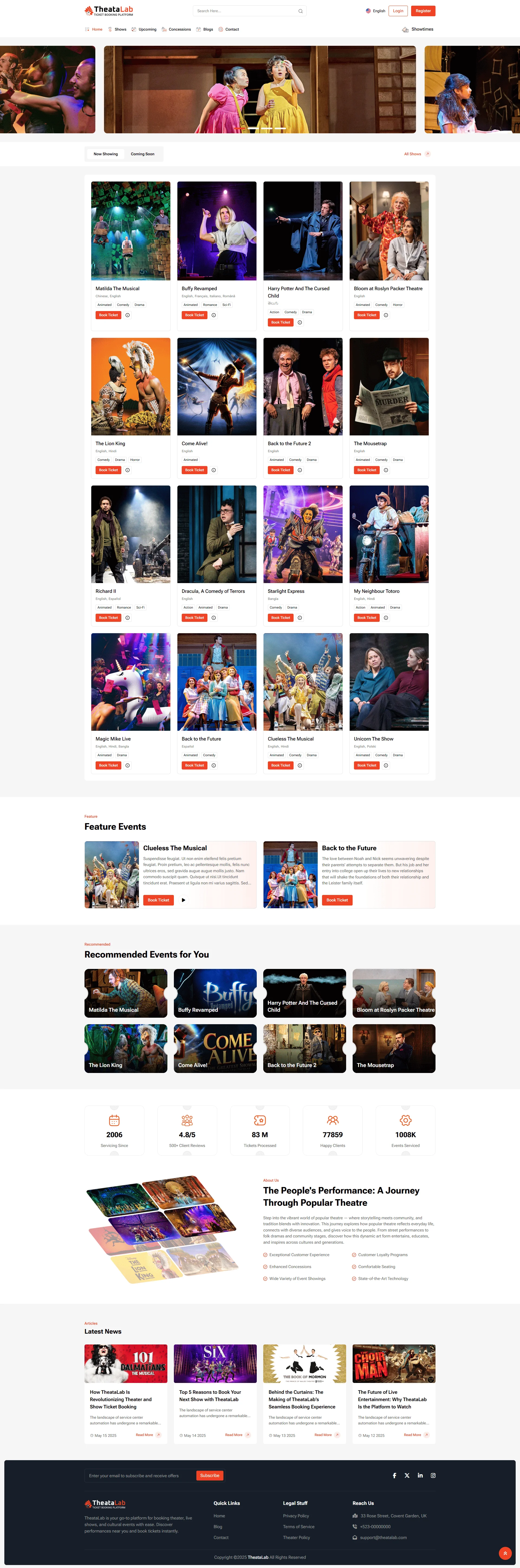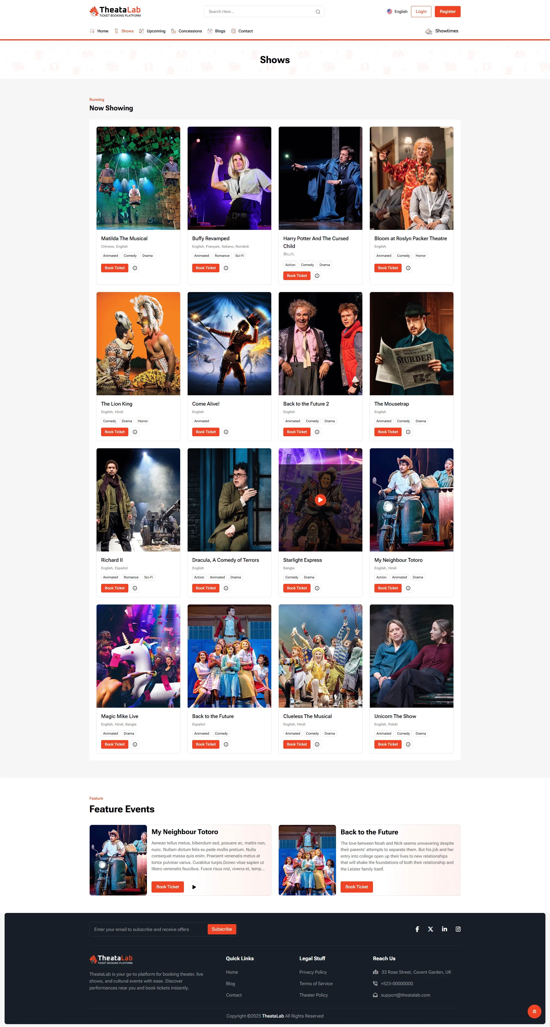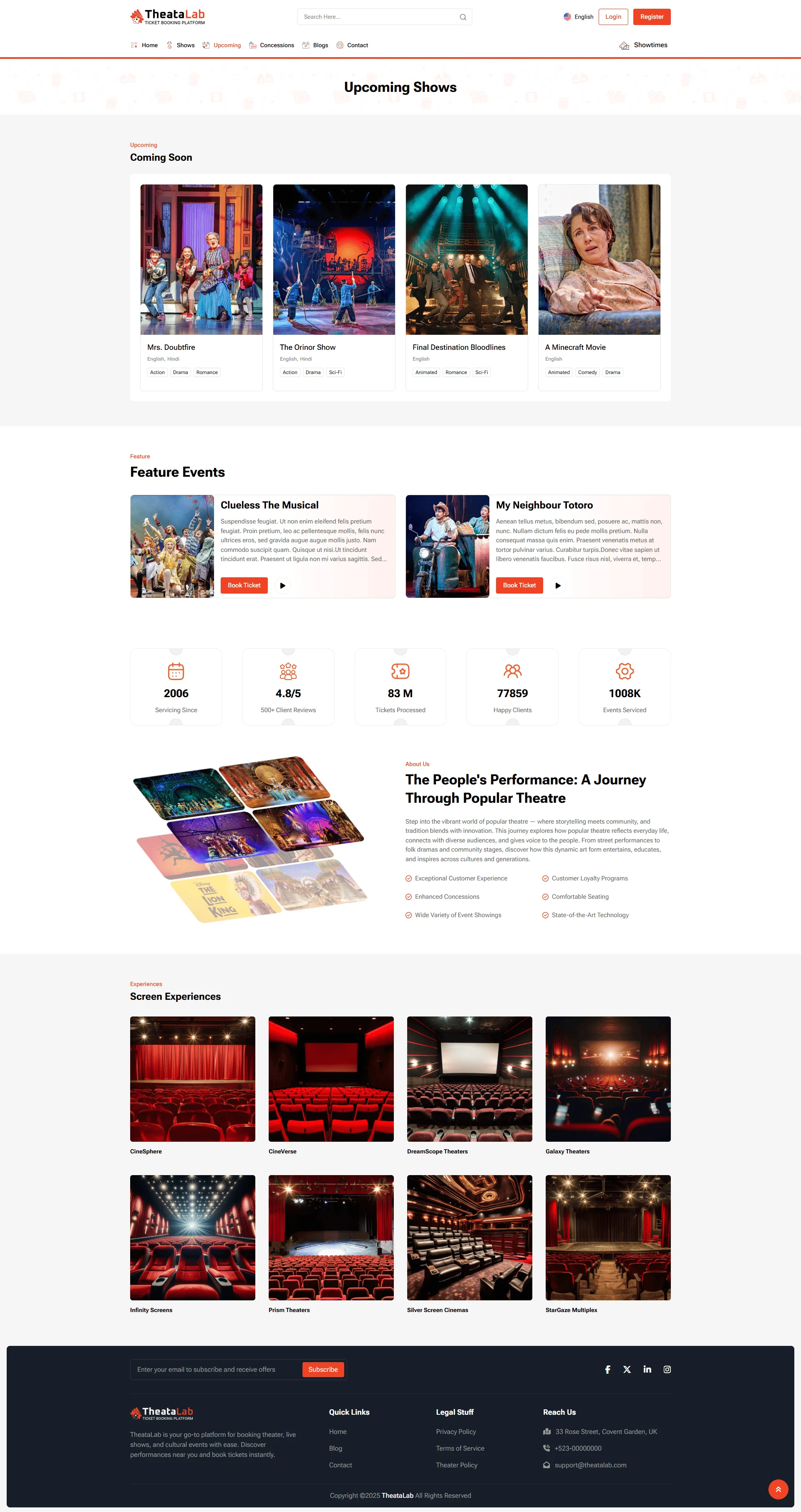 Experience theater and Shows ticket booking like never before — no monthly fees, no hidden charges, and no encryption hassles. Get lifetime access at an affordable price. Discover a live Cineplex ticket booking platform built for seamless transactions in the theater industry. With a dynamic admin panel, managing online transactions and top-ups has never been easier. Our platform ensures a secure connection for your peace of mind, along with effortless social media integration and multiple payment options to fit your needs. At TheataLab, your convenience is our priority. Enjoy a smarter, safer, and more engaging digital experience with a user-friendly interface and a responsive, elegant design that works seamlessly across all devices.