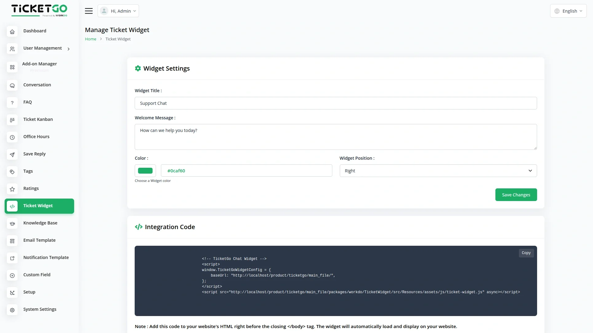 The Ticket Widget Add-On is designed to align effortlessly with your brand while keeping technical setup minimal. You can personalize the widget by setting a custom title and welcome message that matches your tone—whether professional, casual, or conversational. The color scheme is also fully customizable via a color picker, allowing it to seamlessly blend into your website’s design. You can choose the widget’s position—left or right—based on your layout preferences for optimal visibility. Once you've configured the settings, the system generates a ready-to-use script that only needs to be embedded into your website’s HTML, just before the closing tag. With no complicated installation steps, the widget appears instantly on your site, allowing users to start submitting tickets right away.