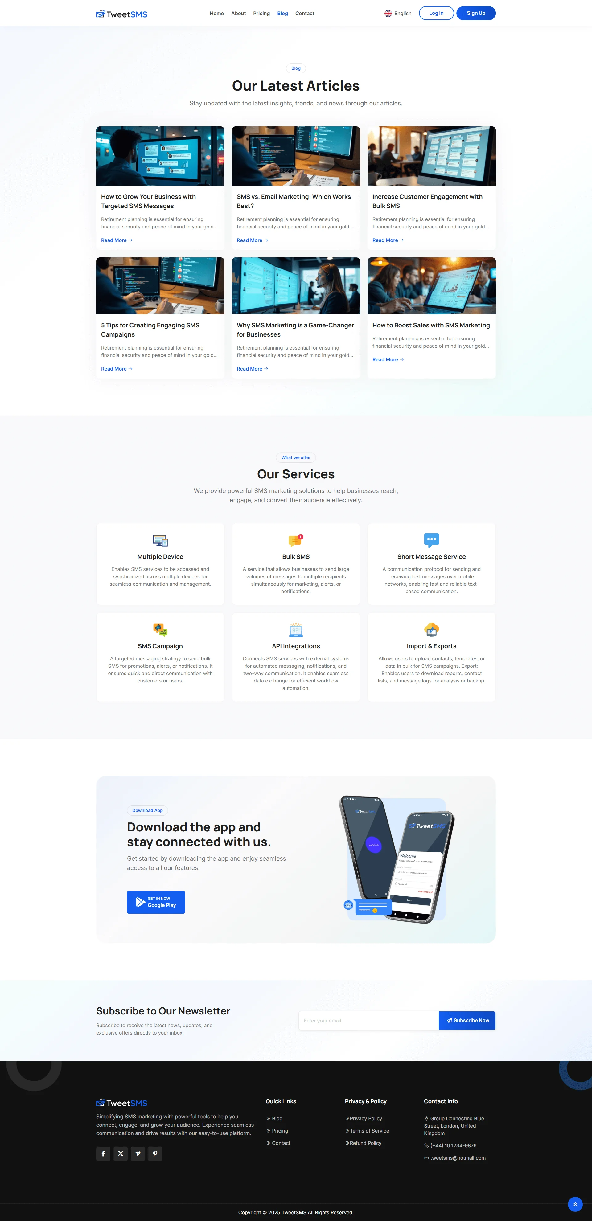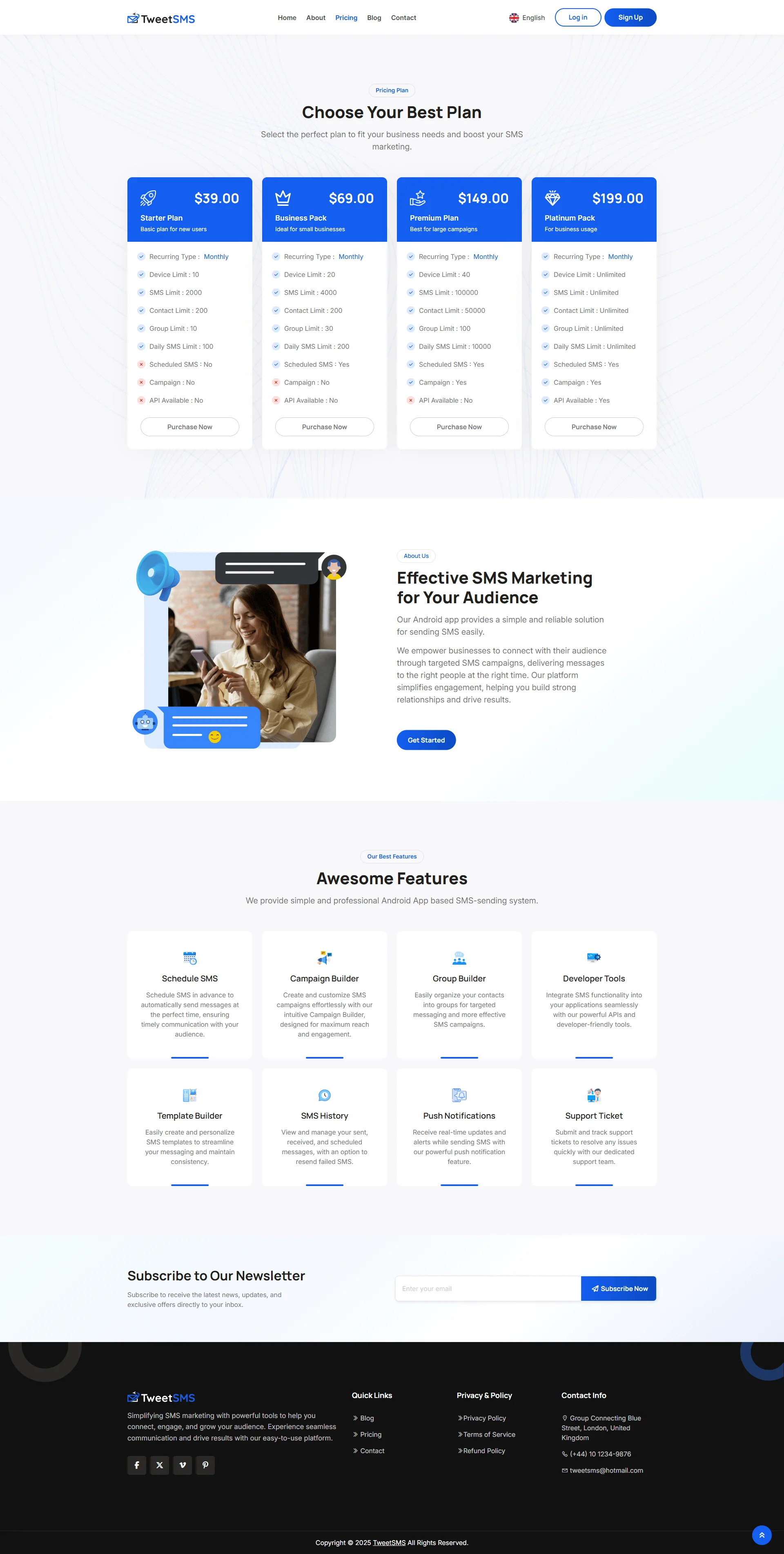 TweetSMS is a comprehensive Self-hosted, Unlimited device, and SIM-supported SMS marketing SaaS platform, designed for entrepreneurs and businesses looking to launch their own SMS marketing service. This out-of-the-box solution includes everything you need to start and grow your SMS marketing SaaS business. The package comes with a fully functional User Dashboard, Admin Panel, Contact List Management, Campaign Management and Developer Tools, and more. With TweetSMS, you can offer your clients a seamless way to create, manage, and track SMS marketing campaigns, while you run your own profitable SaaS business. SMS marketing is a powerful tool for businesses to directly engage with their customers through mobile phones, ensuring high open rates and quick responses. You don’t need to invest in costly custom development or hire a team of developers. TweetSMS provides you with a ready-to-go platform, and we offer full support, installation, and customization services to help you get started quickly. Don’t miss out on the opportunity to enter the SMS marketing industry – get your copy of TweetSMS today and launch your own SaaS business in no time!