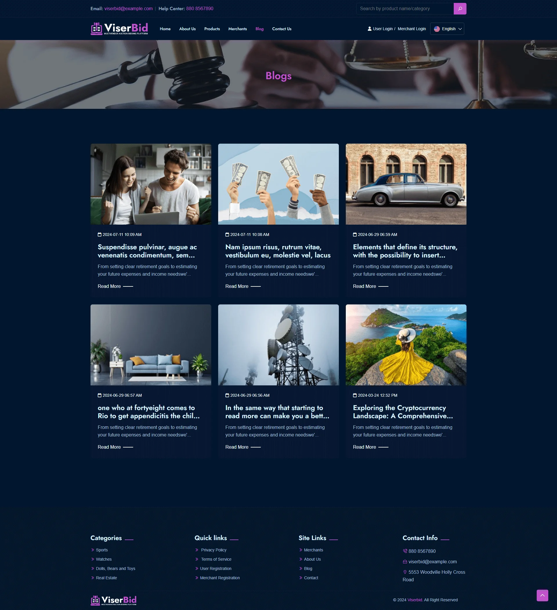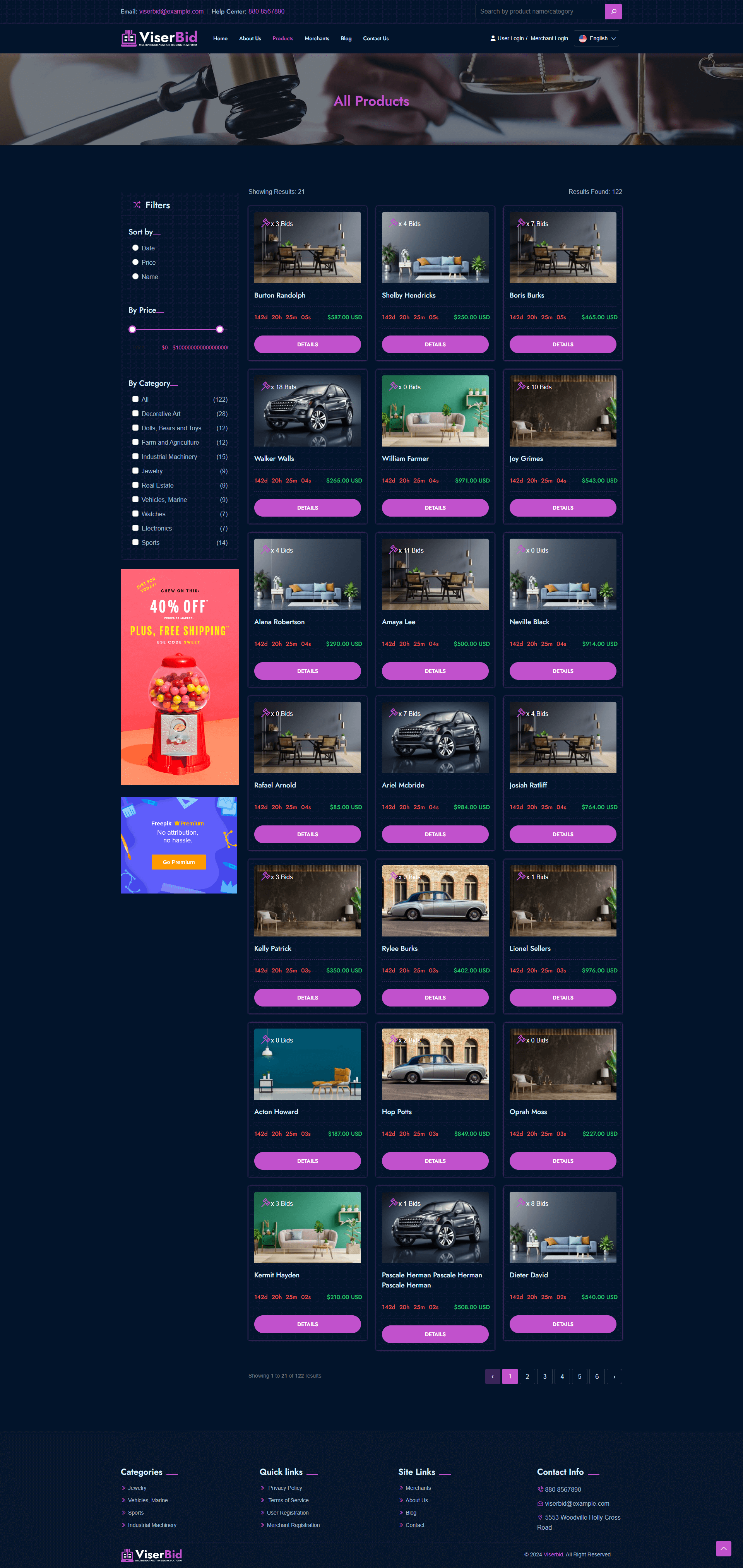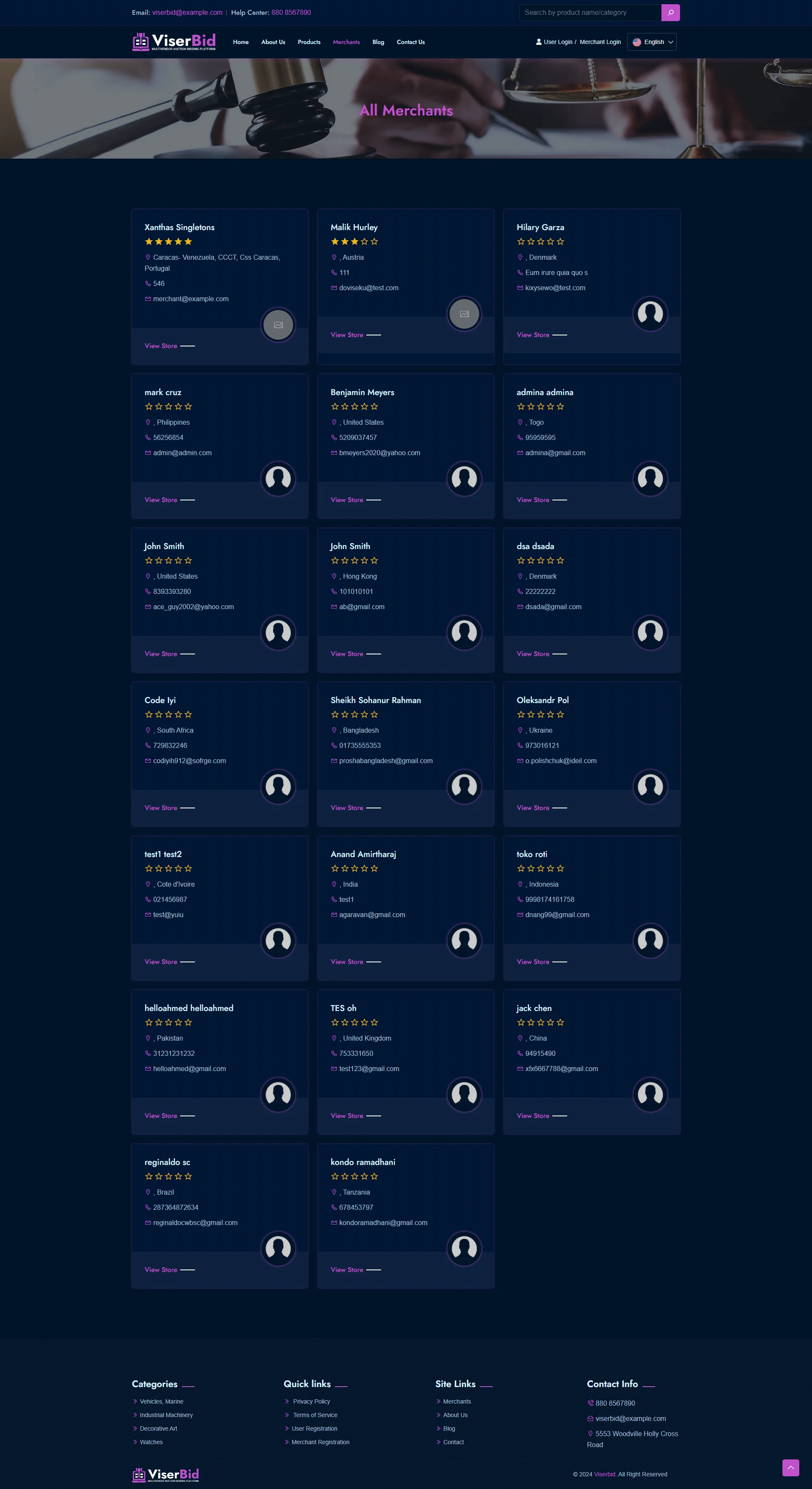 ViserBid is a complete solution for a Multivendor Bid and Win (Auction) website. ViserBid is an online-based platform that helps merchants and businesses from across the globe to sell their items by setting up an auction. A Marketplace auction platform is exactly what it sounds like: auctioneers list their catalogs in an online auction Marketplace right alongside their competitors. Common Marketplace auction platforms include Invaluable, the-Saleroom, EasyLive Auctions, and Live Auctioneers. operations here on ViserBid is very simple, the Merchants can set unlimited auctions from the Merchant panel, users are able to register for free and they are able to BID any item by any amount. when auction time will be finished, the top BIDDER will win the product or service. ViserBid is endlessly appealing, feature-loaded, customized, and possesses the remarkable capability of running on all devices and operating systems. This script comes with various automated online payment gateways to make the payment more easier and flexible.