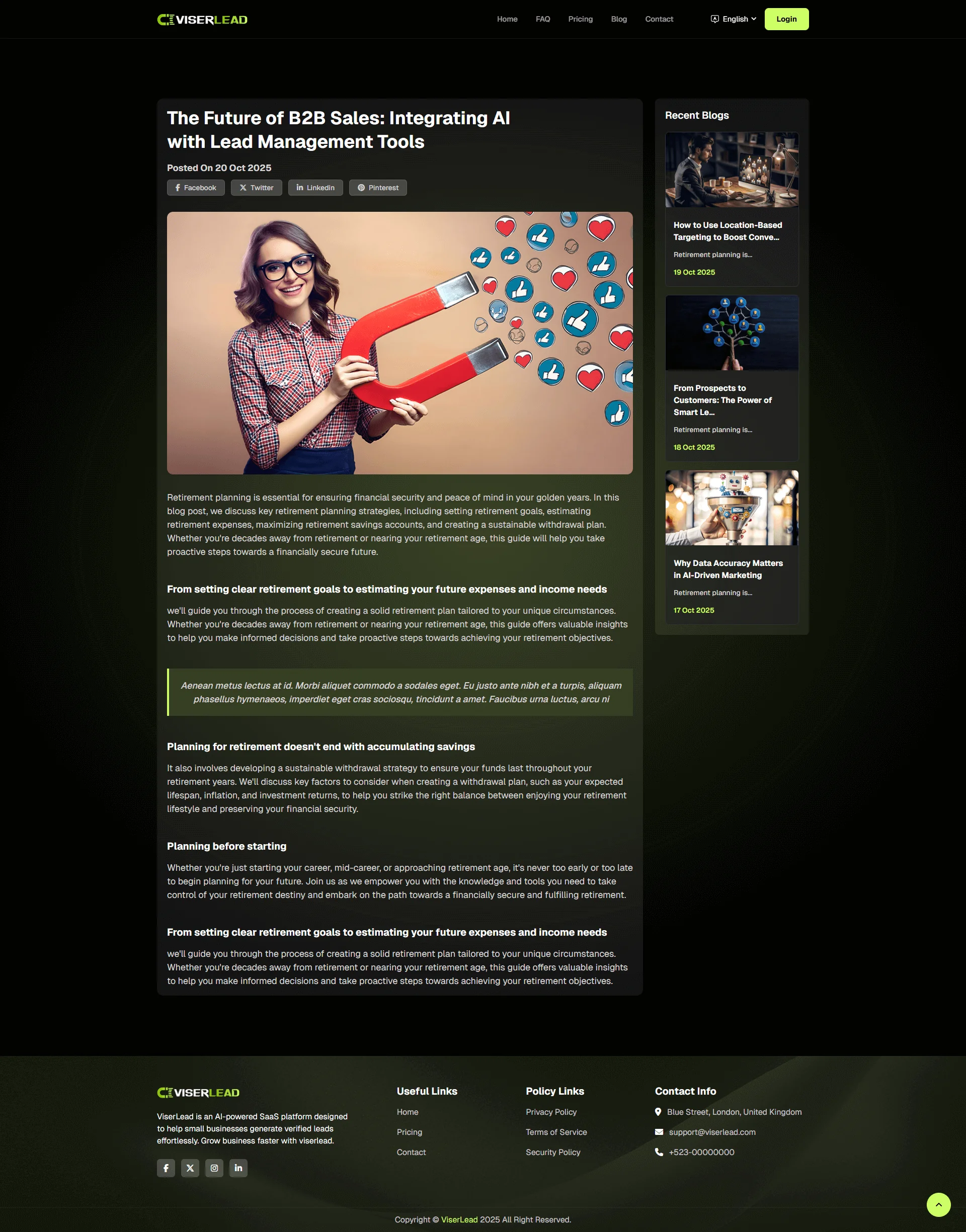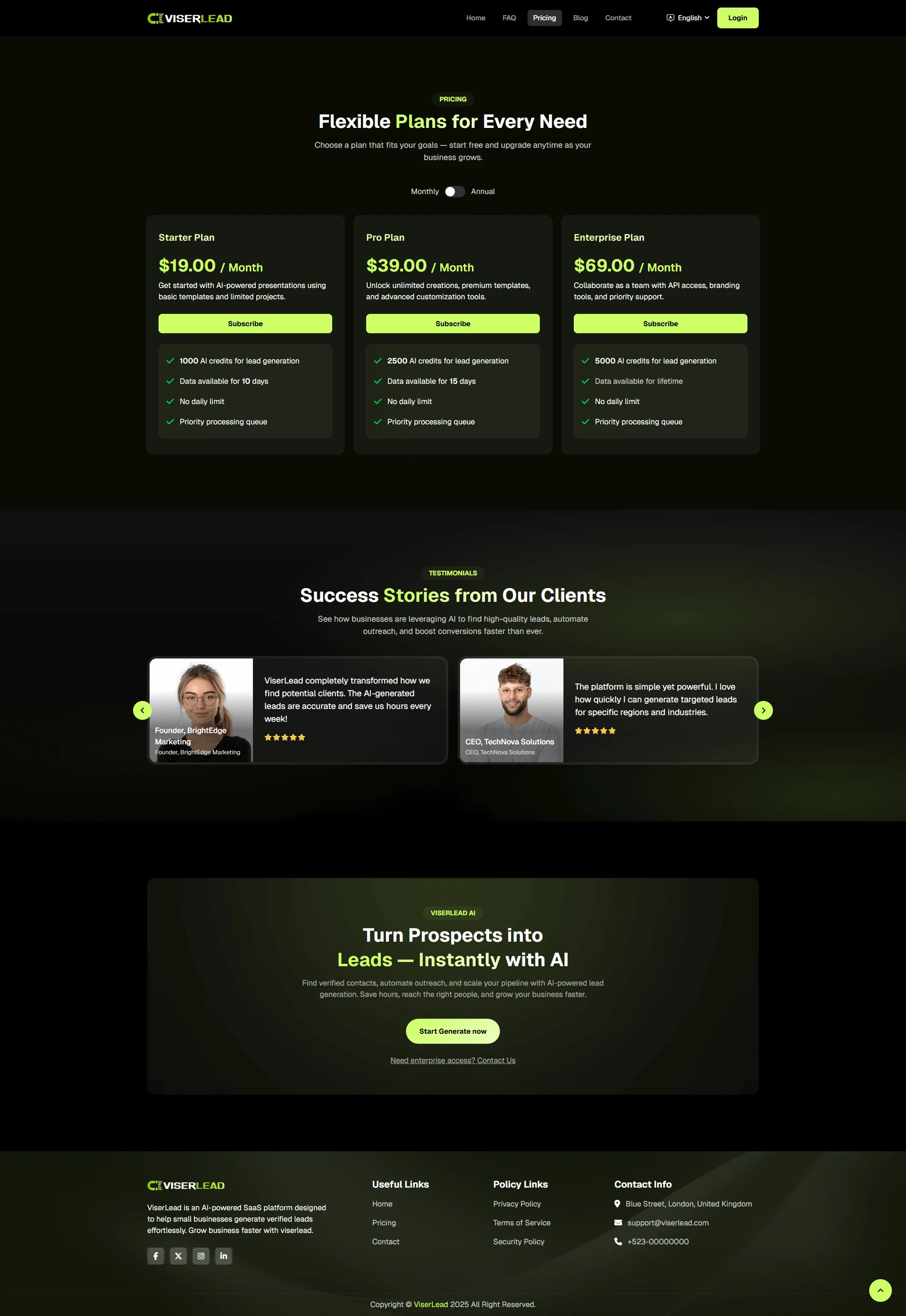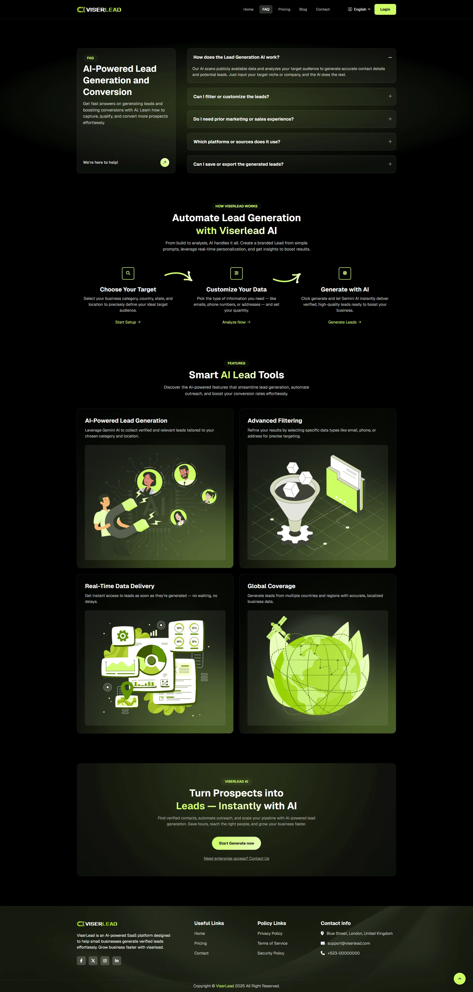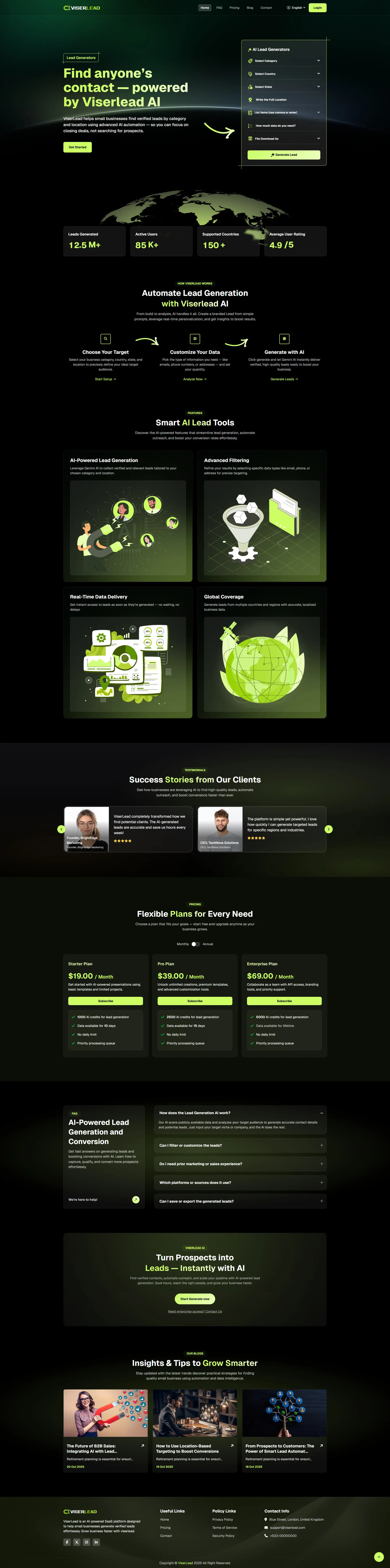 ViserLead is an advanced AI-powered lead generation automation platform designed specifically for small and medium-sized businesses. ViserLead is an AI-based lead generation platform that uses artificial intelligence (AI) to automatically find, attract, and qualify potential customers Information (leads) for a business. By using the Power of AI, our system gathers data from multiple sources, such as websites, social media, emails, CRMs, and online behavior. We value your money, and we know collecting customer data is costly, but now you don’t need to pay thousands of dollars for your targeted customer information. Our Solution can save your time and money. No Monthly Fees, No Hidden Charges! Own a powerful, feature-rich lead generation automation platform for a one-time, affordable payment for a lifetime. No recurring fees, no encrypted limitations.