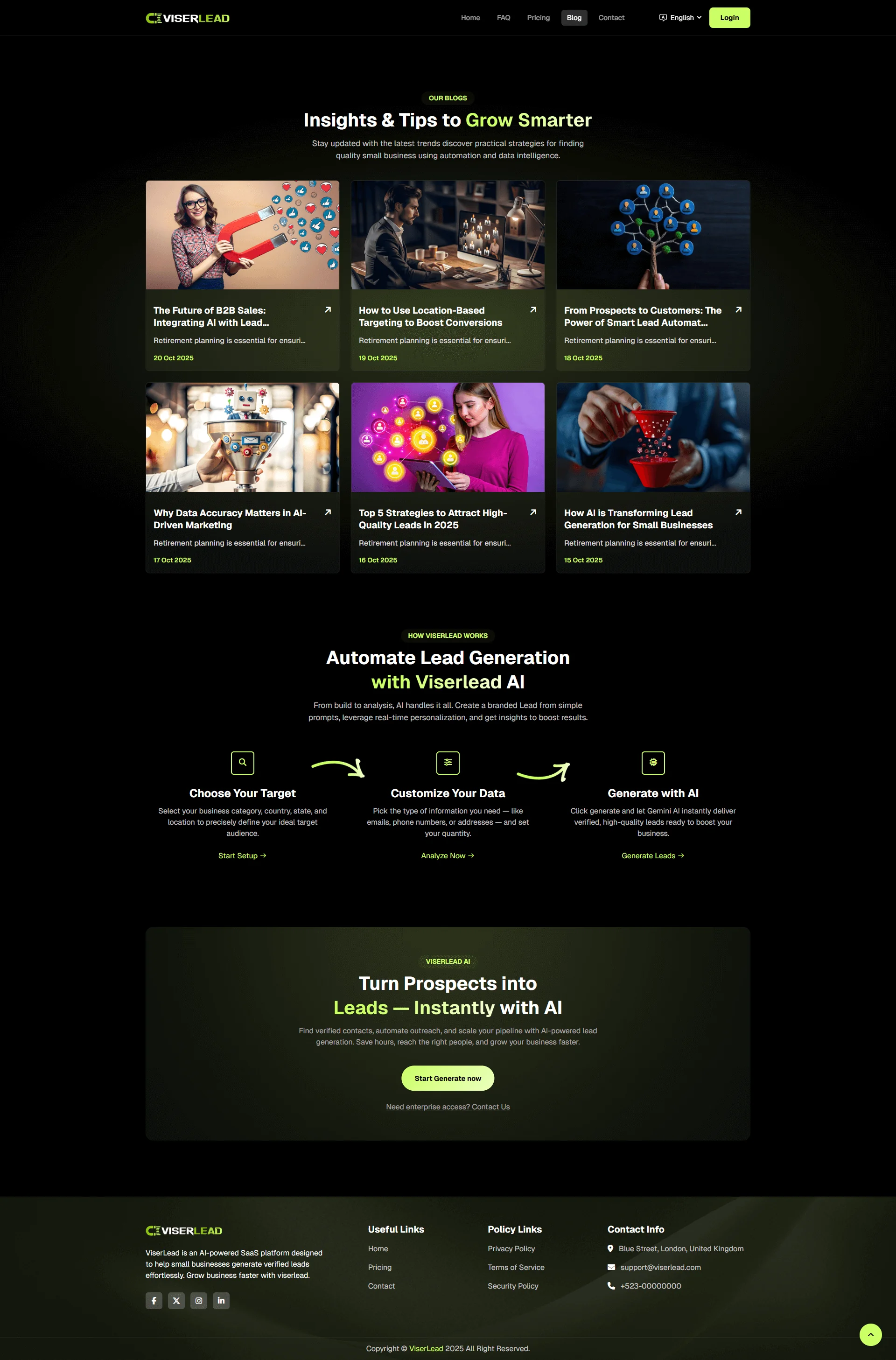ViserLead is an intelligent lead-generation SaaS platform designed to help small businesses attract more customers with less effort. Powered by advanced AI, ViserLead automates prospecting, identifies high-intent leads, and delivers personalized outreach that converts—without requiring marketing expertise or large budgets.