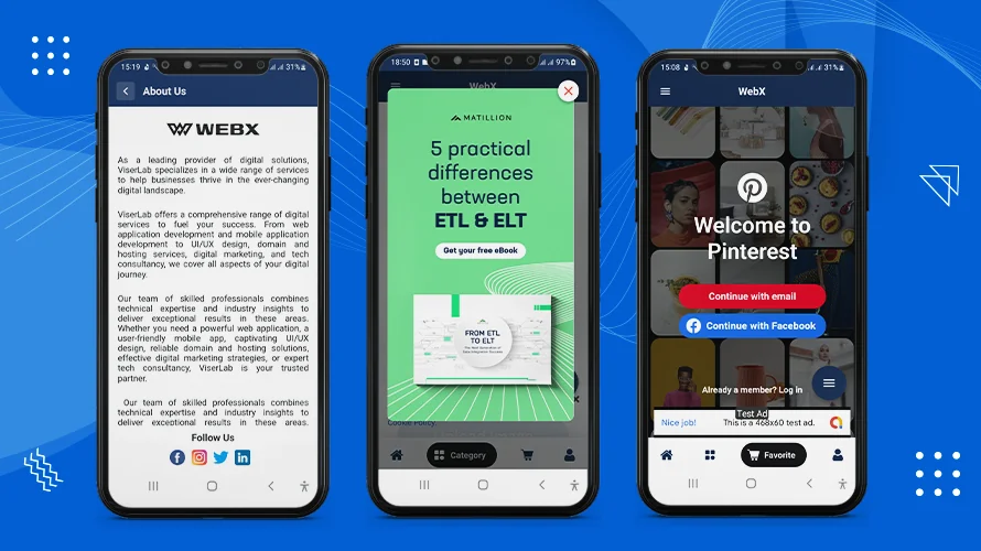 WebX is your go-to solution for effortlessly turning web content into a customizable mobile app. Our cutting-edge Flutter application, compatible with both Android and iOS, ensures easy access to your business and services via mobile devices. Transform your website into a mobile app in just seconds. With WebX, you can customize onboard screens, manage multiple ads, and personalize navigation bars, floating buttons, and menus including multiple items. It also allows you to enable and disable all the features through general settings and many more customization.