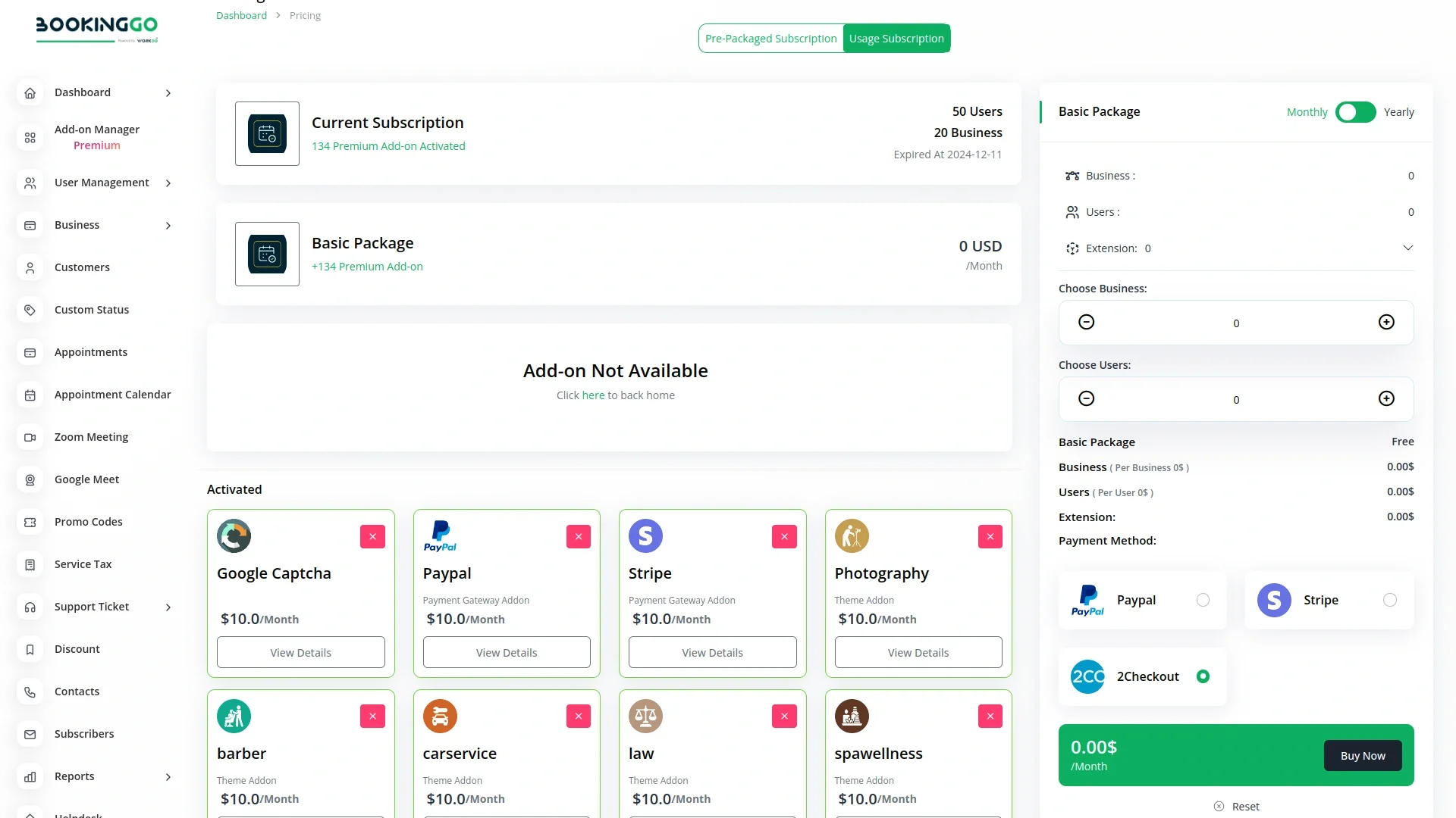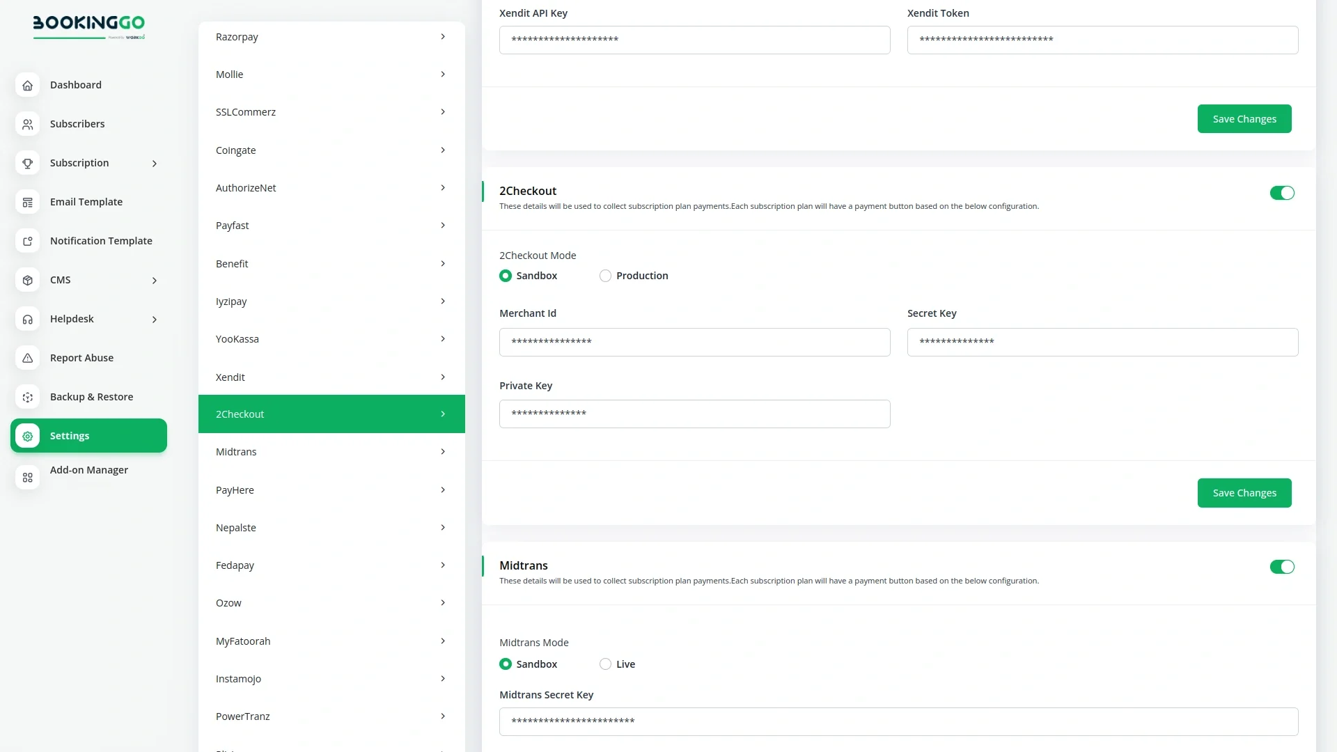 Integrate the global-standard 2Checkout payment gateway into your BookingGo SaaS platform, enabling businesses to accept secure payments, manage global currencies, and simplify appointment or subscription billing on a single platform.