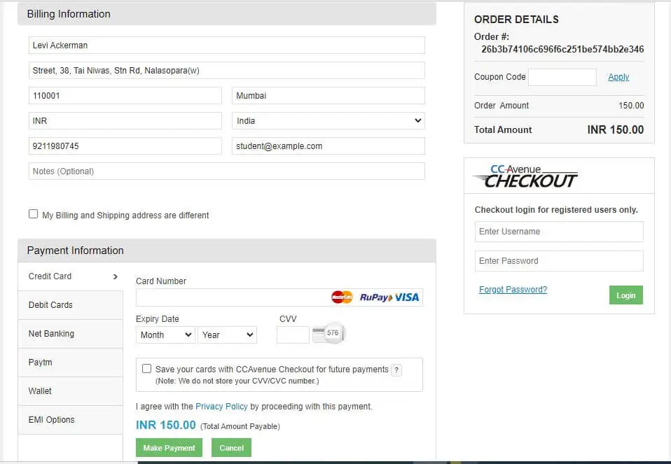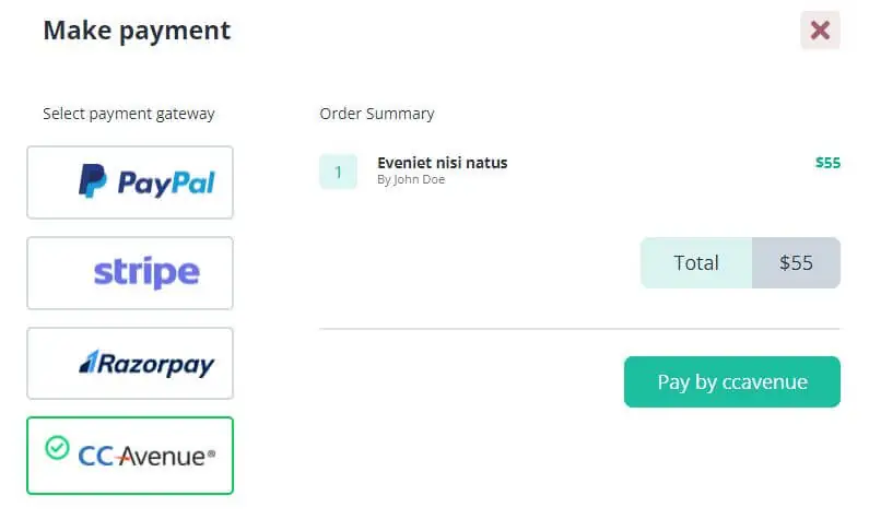 This addon provides CCAvenue payment gateway facility to Academy LMS students during purchasing a new course. By installing this addon, you can sell courses to your students by the popular Ccavenue payment gateway.