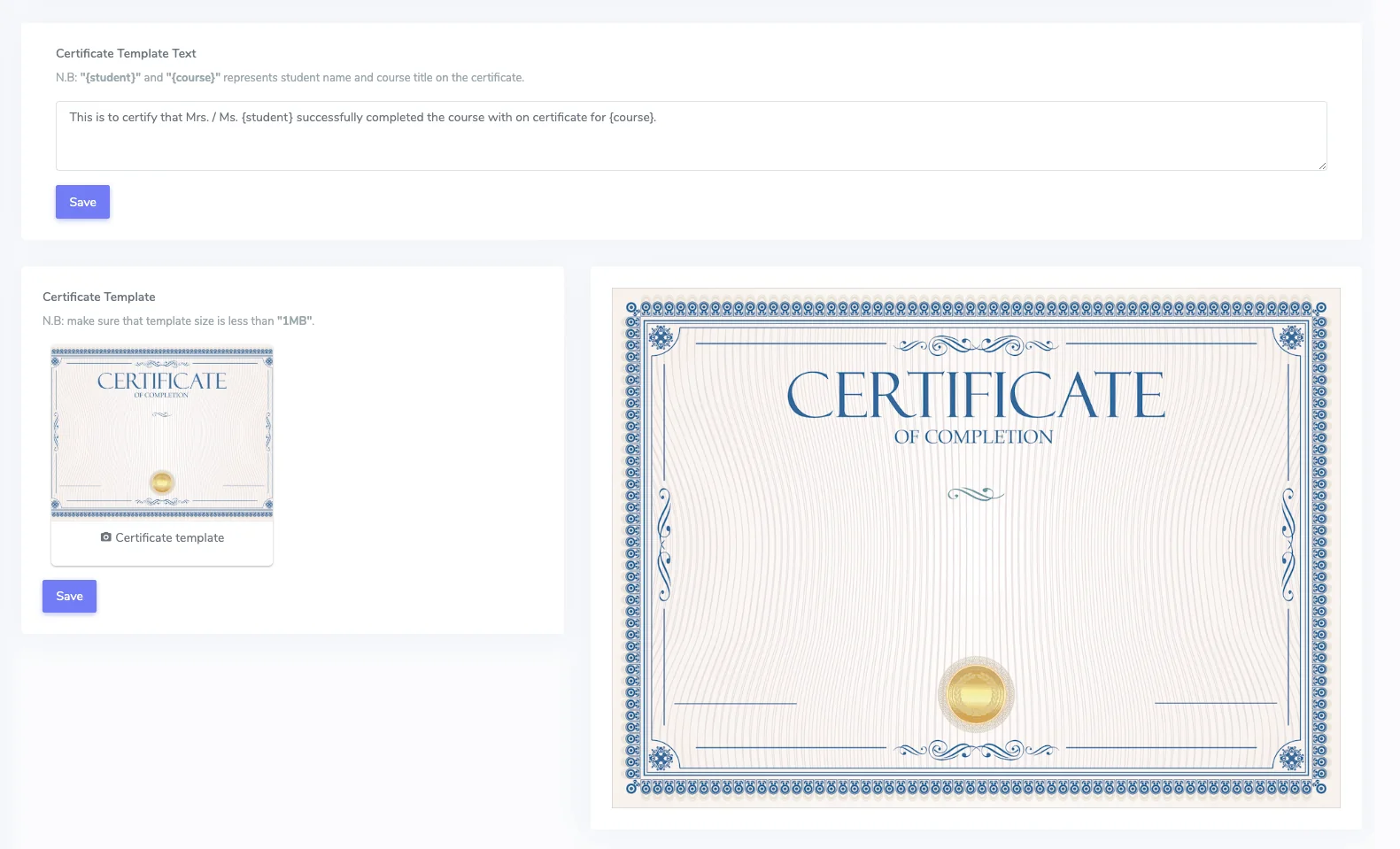 This addon provides certificate to Academy LMS course students. Students are required to complete 100% course progress to generate it’s certificate. Certificate can be downloaded or showed online elsewhere for verification through a public url.