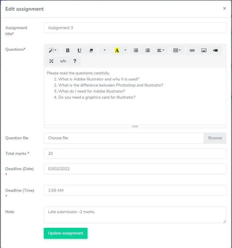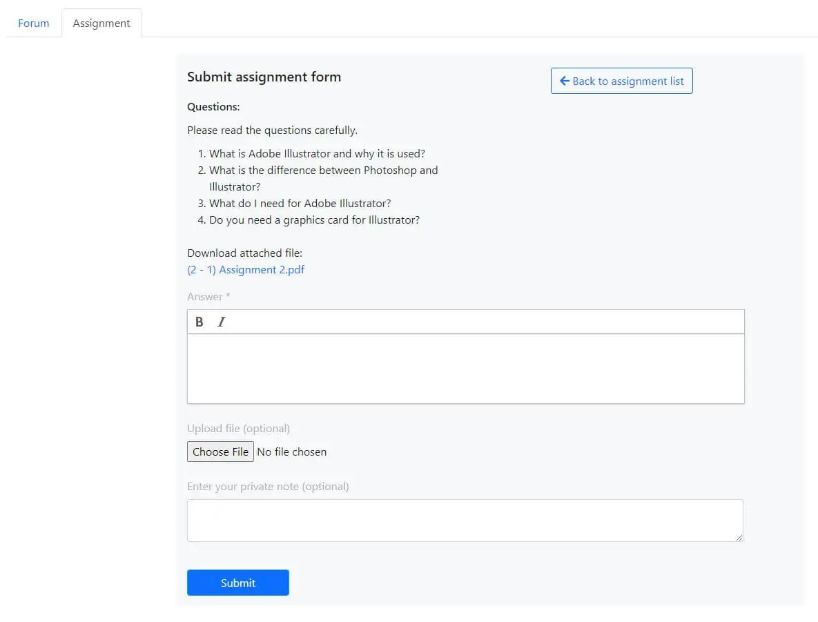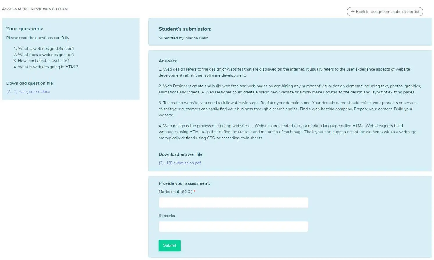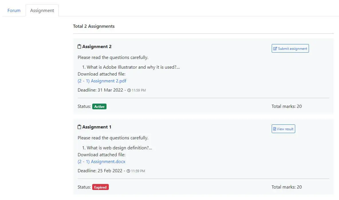 This addon provides assignment submission facility to Academy LMS online course students. Course instructor or teacher can provide assignment on their course topic to check the learning performance of students. Students have to submit the assignment answers based on their learning which is assessed by the teacher and they can justify their performance upon learning from that course.