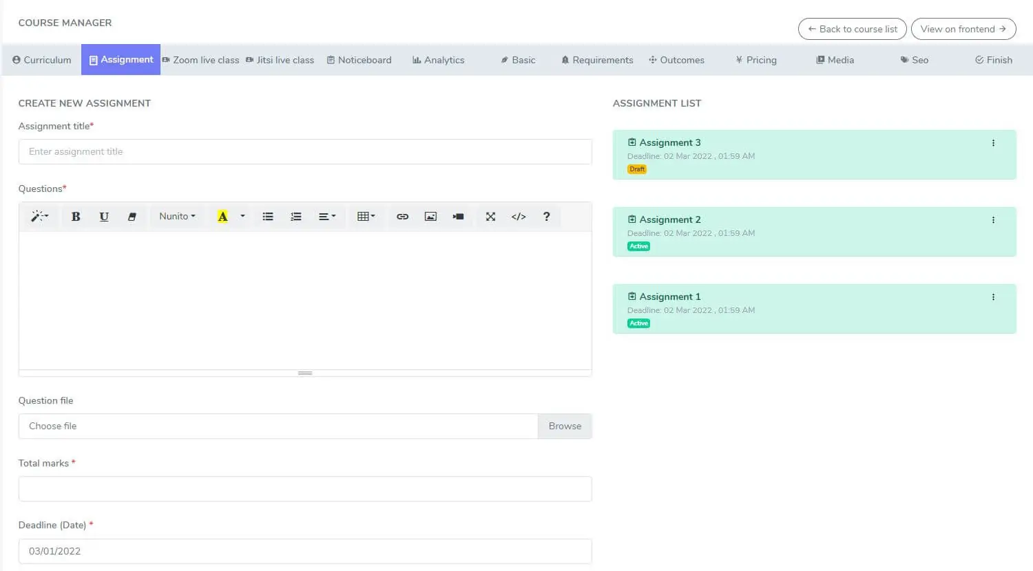 The Course Assignment Addon for Academy LMS allows instructors to assign tasks and assess student performance in online courses. Students can submit assignments directly through the platform, track results, and improve their learning outcomes. This eLearning addon enhances interactive learning, boosts student engagement, and helps instructors measure progress—making your LMS more effective and academically focused.