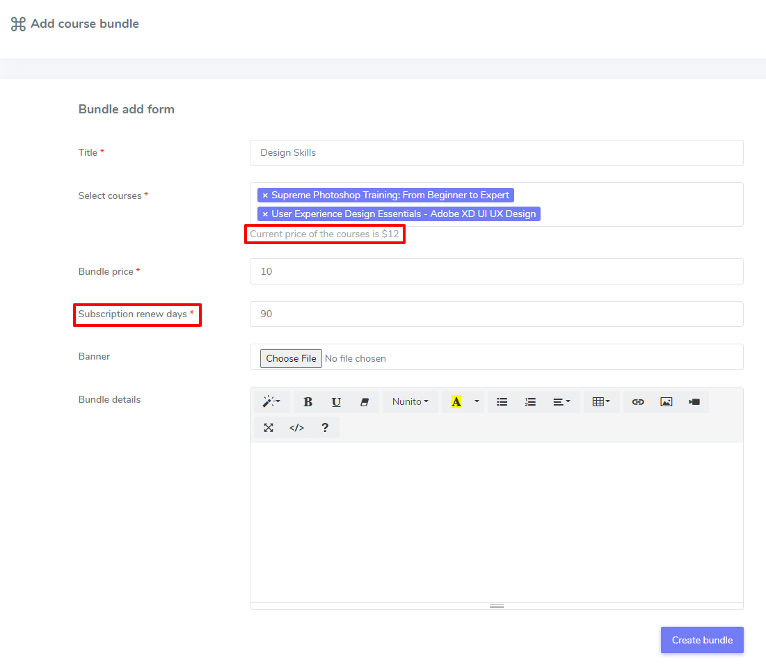 Admin can create a course bundle from the Add new bundle option. The admin can set the new discounted price and subscription validity to the new course bundles. Adding subscription time to the new bundles creates a validity period for the bundles. Students will be able to access the purchased bundles for a specific time chosen by the admin. Students need to purchase the bundle again when the subscription time expires.
