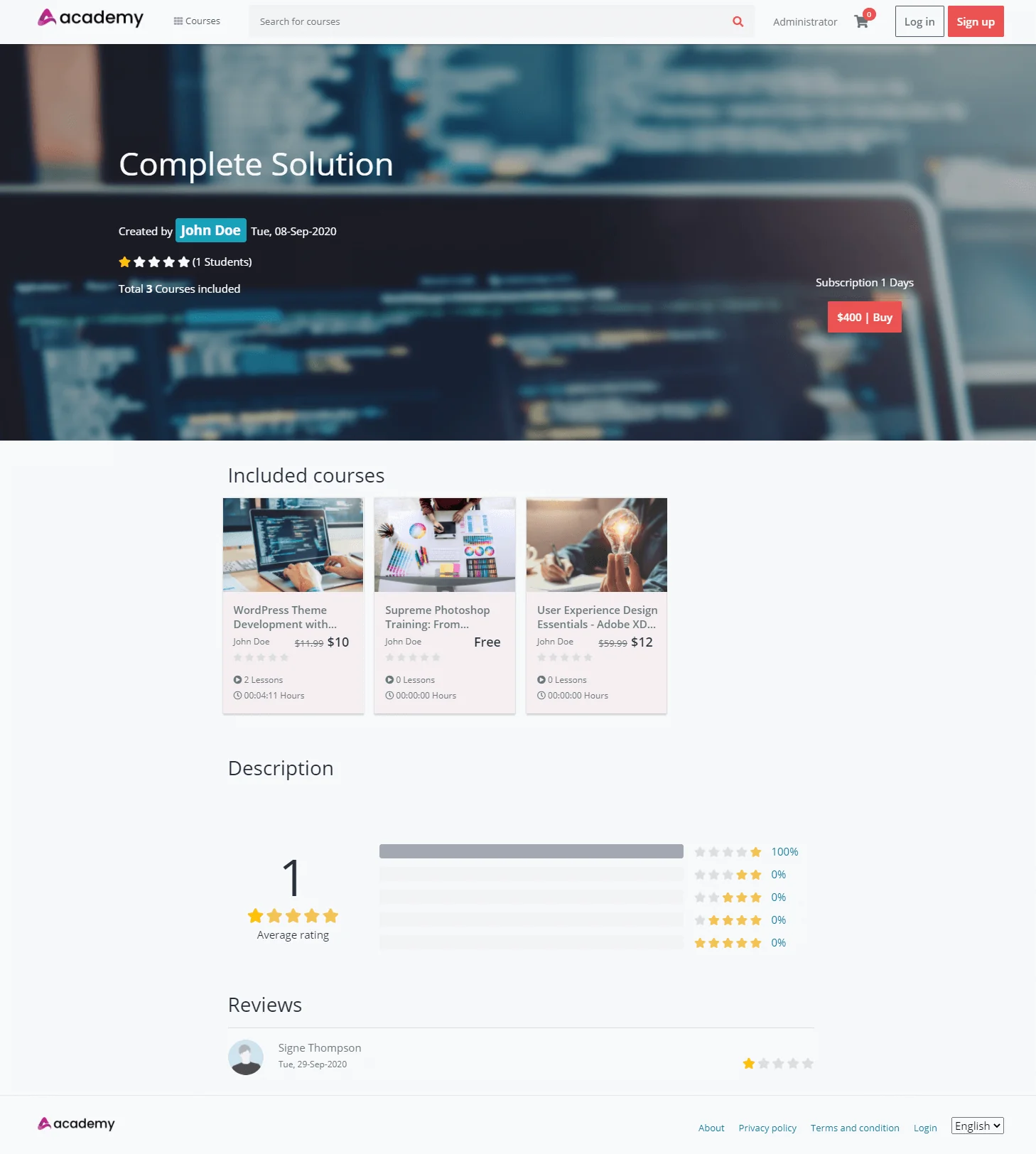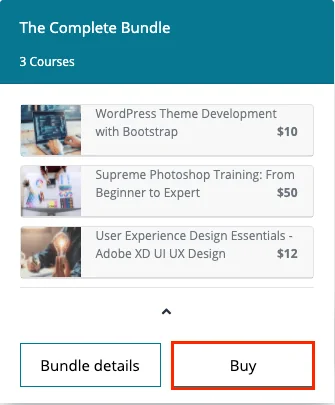 Students can browse the course bundles with or without logging in. Using the option named “Course bundles” on the “Courses” menu students can check the details of the bundle and the courses included in a bundle. The bundle rating, number of subscribers, and bundle’s pricing info are shown here