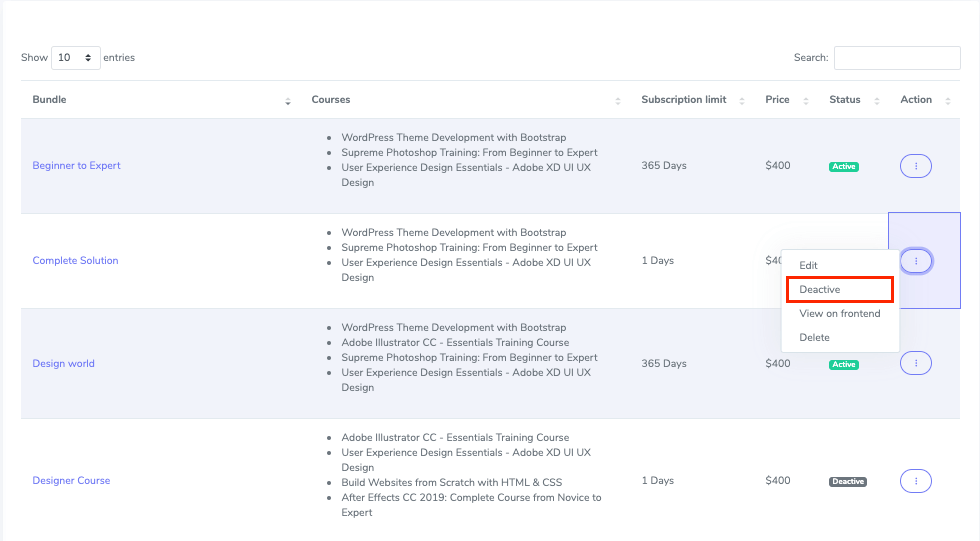 From the manage bundle option, the admin can check on the bundle status and other information like bundle details, subscription limit, and price. The admin can edit, delete, Activate or Deactivate the bundles from here