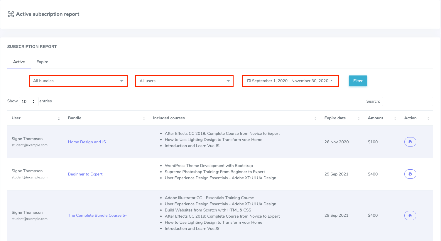 Admin can also view subscriber information, bundle details, subscription expiry dates, and payment reports from the Subscription report option. All the payment reports are printable. Searching and filtering of the reports based on bundle names, dates, and user names are included here