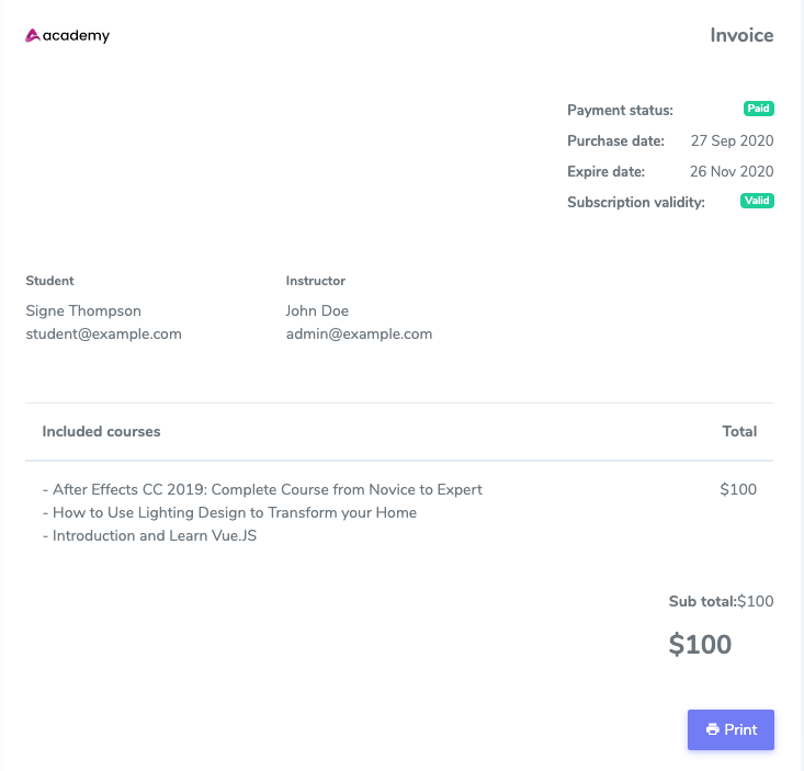 The printable payment invoice contains course details, subscribers information, payment report, and subscription validity of the purchased course bundle