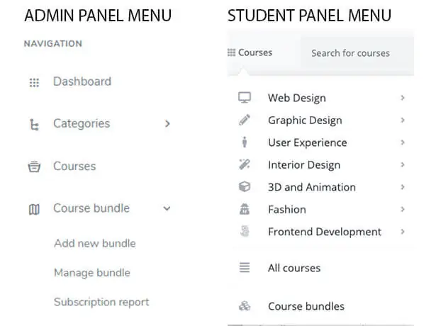 The new addon Course Bundle will be available both in the Admin user and the Student user menu. From the option, the admin and students can access the course bundles.